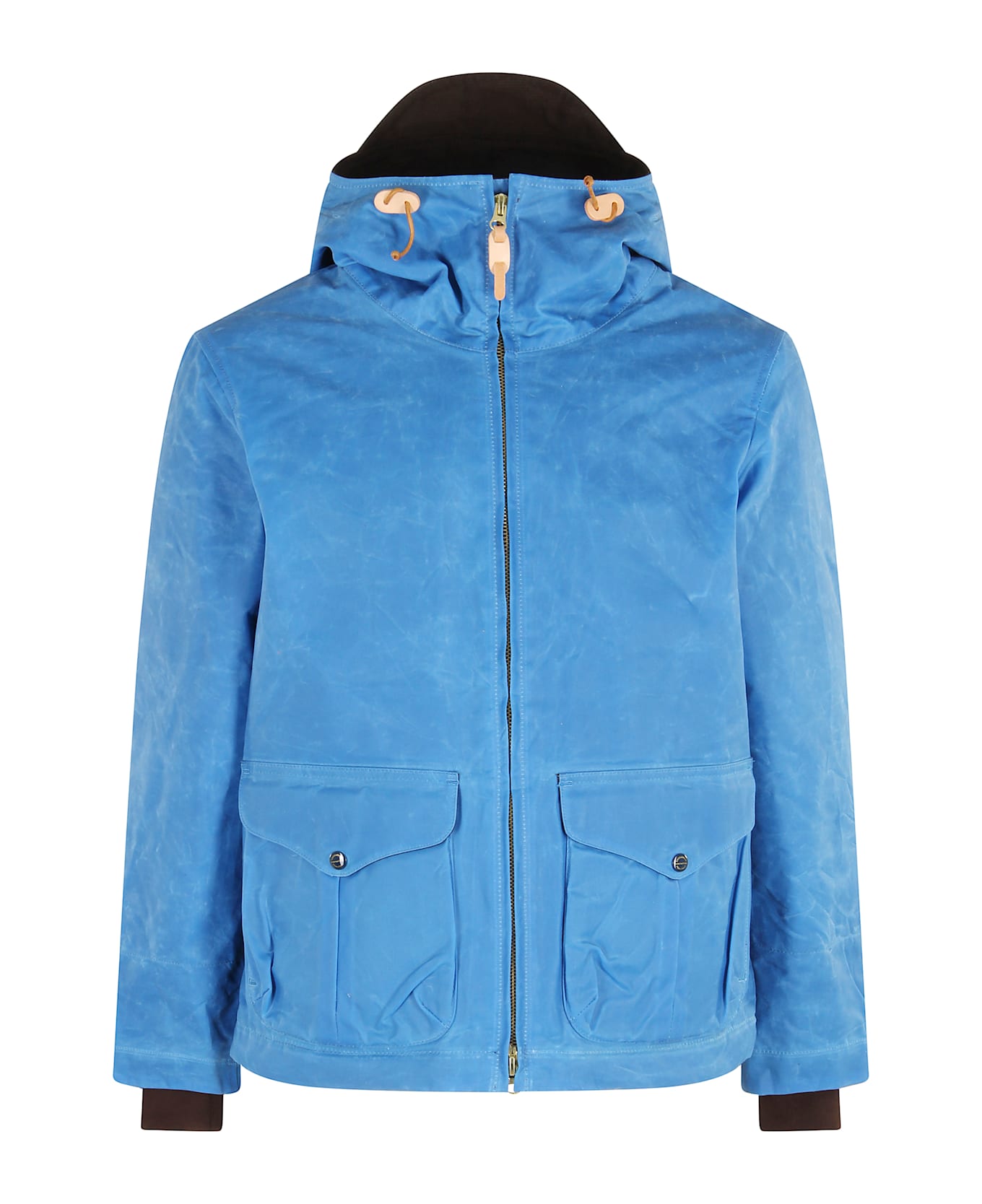 Jacket - Manifatture Ceccarelli - Medium blue color - Water-repellent waxed cotton fabric - Teddy lining - Hood - Side pockets with flap and button - Front zipper closure