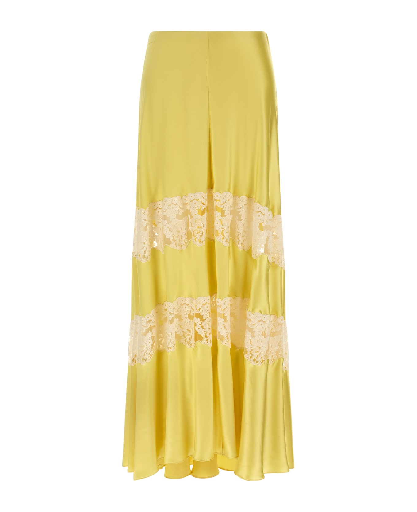 Long skirt in shiny viscose with contrasting lace inserts, flared silhouette, elastic waistband, and asymmetrical hem. Composition: 100% viscose