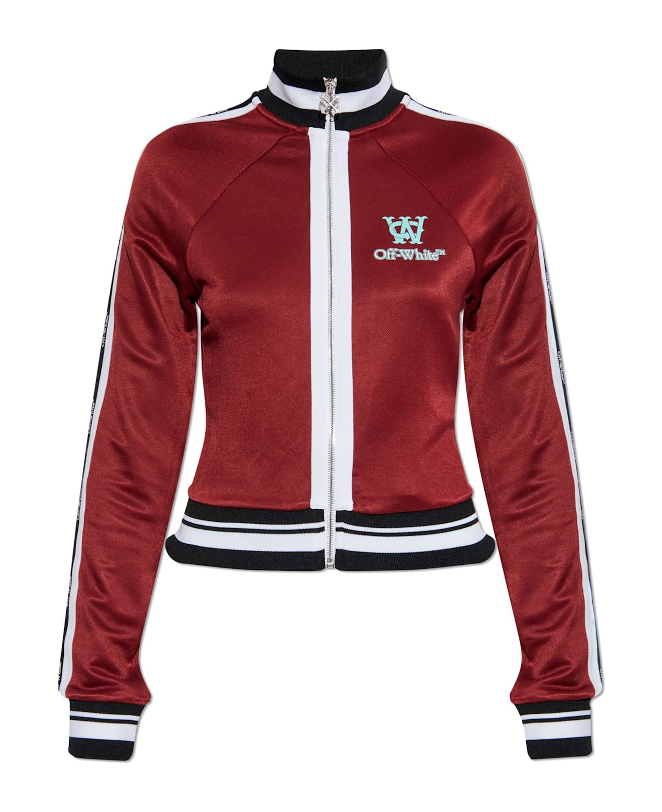 Indulge in refined athletic luxury with the Off-White Logo Zip-Up Jacket, a sophisticated statement from the illustrious collection by Virgil Abloh. The tailored, waist-length silhouette embraces a contemporary, sport-inspired essence, elevated by a sleek, satin-like fabric meticulously crafted from a premium blend of rayon and polyamide. The distinguished deep burgundy hue is accented by bold white striping along the sleeves, a striking white central zipper, and a refined black-and-white ribbed finish at the cuffs, hem, and collar. The iconic sky-blue OW emblem and signature