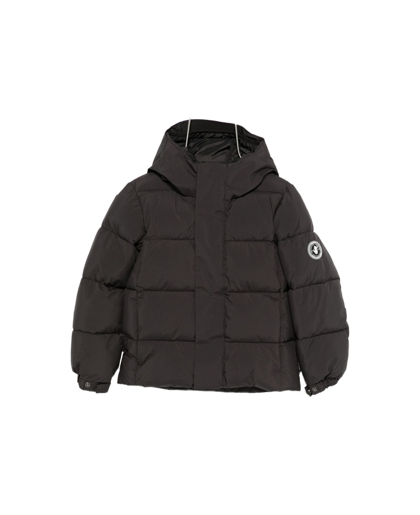 Save The Duck Kids Brown/black down jacket with a covered zip closure and windproof padding. Non-removable padded hood.
