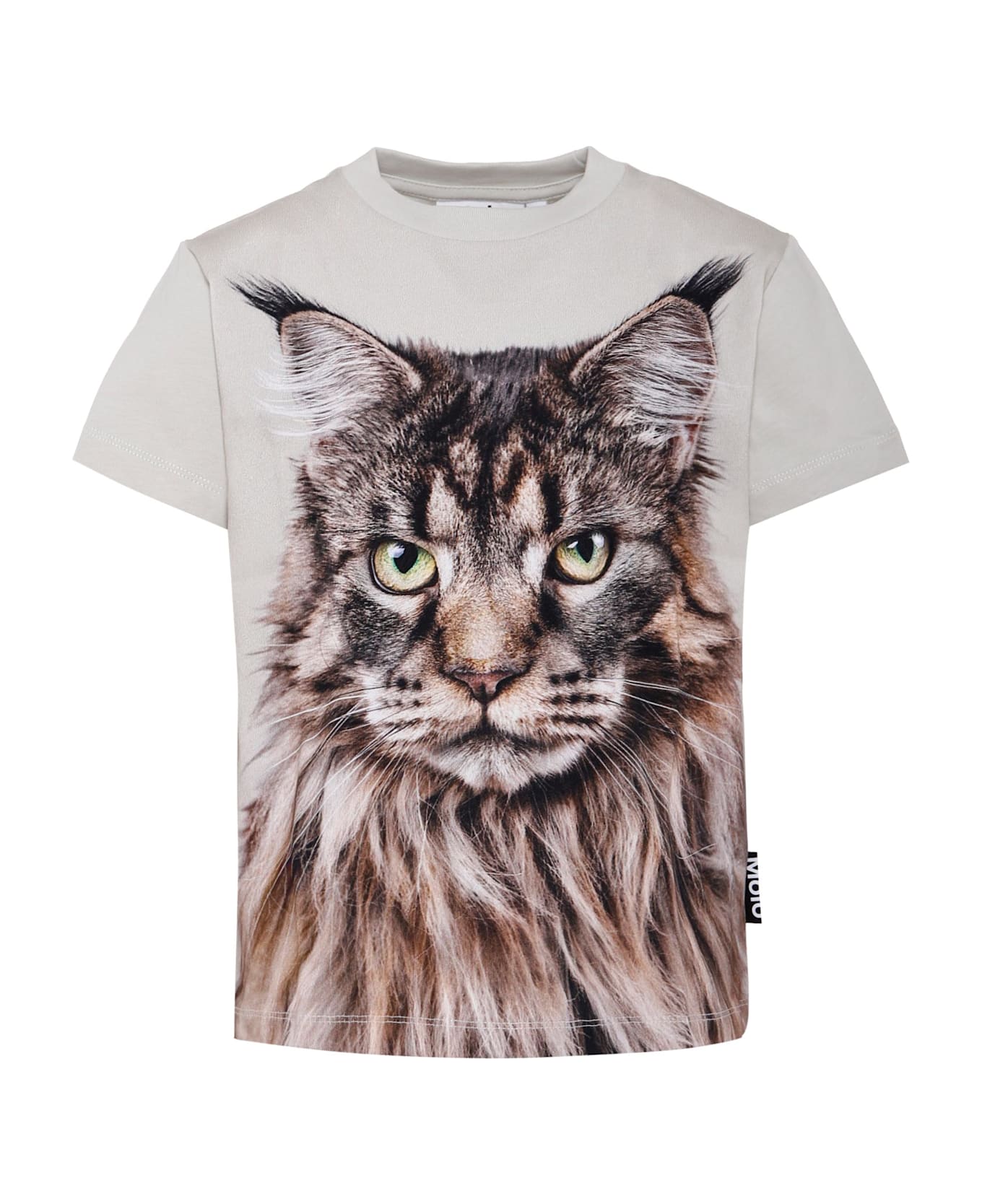 Beige t-shirt in heavy organic cotton, GOTS certified, with short sleeves and a ribbed crew neck. It is embellished with a cat print on the front.