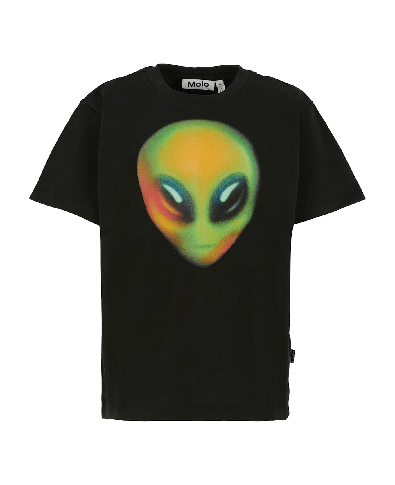 Black GOTS-certified organic cotton t-shirt, with short sleeves and a ribbed crew neck. It is embellished with alien print on the front.