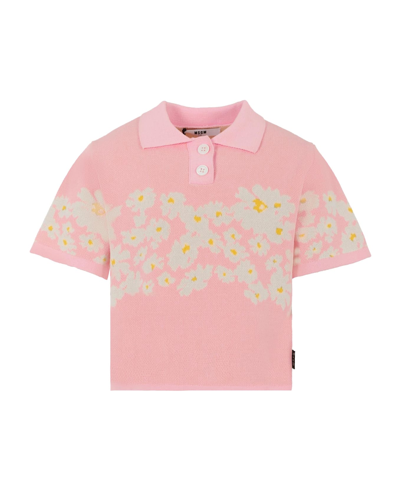 Pink polo shirt in knitted fabric, short sleeves, with pointed collar and front button fastening. It is embellished with jacquard flowers on the front.