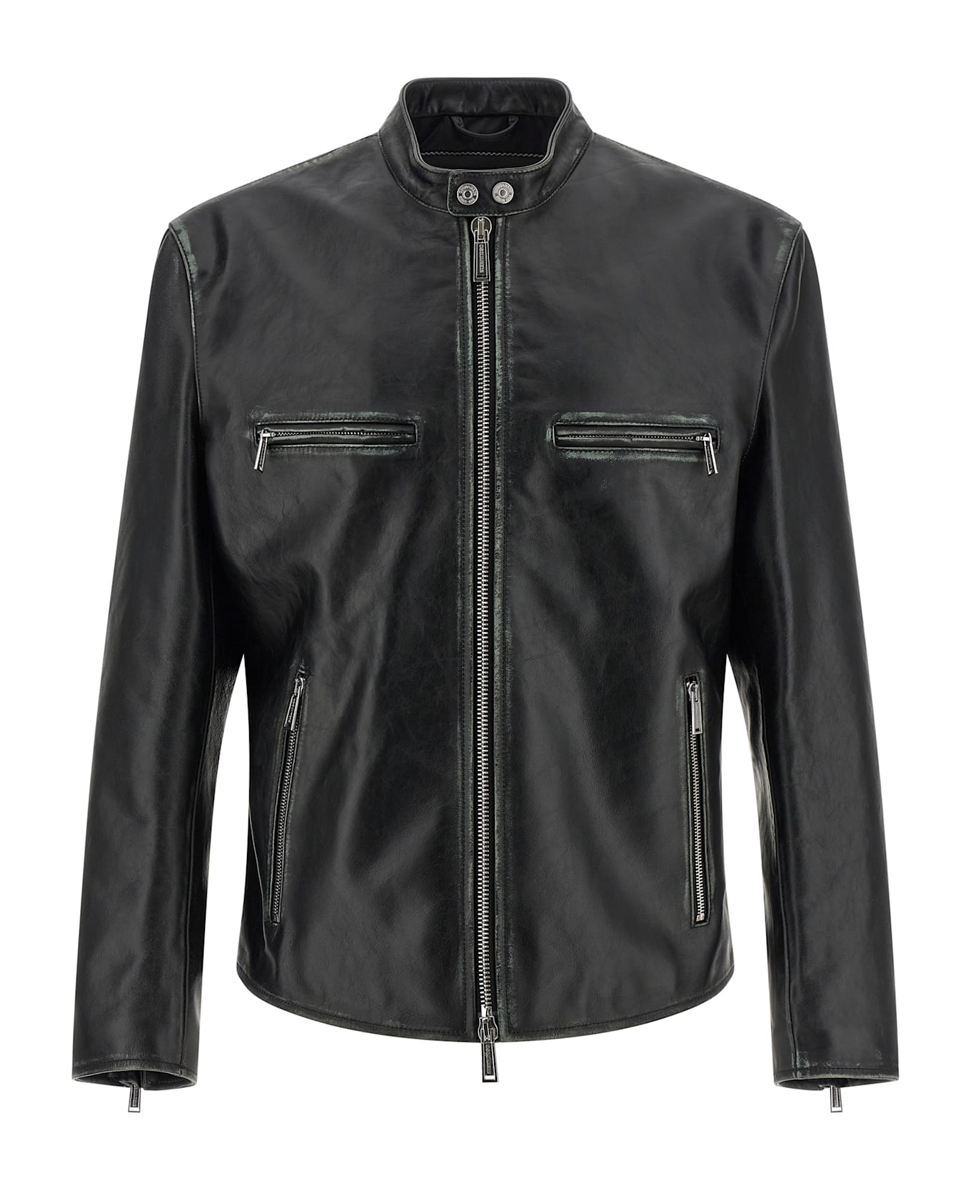 'Bad Boy' biker jacket in used-effect leather, mandarin collar with snap buttons, front zip closure, pockets, long sleeves with zip on the cuffs, monogram lining. Composition: 100% leather