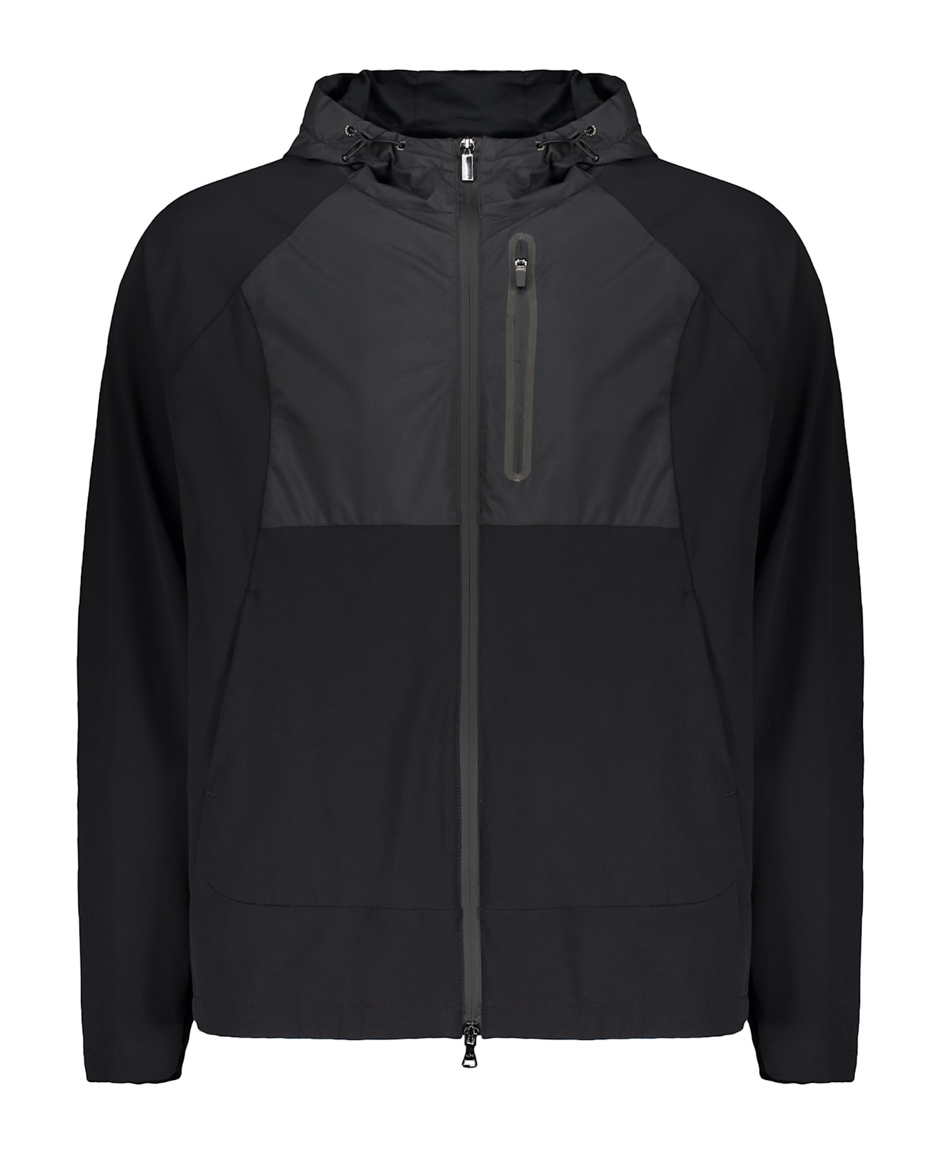 Lightweight jacket with front zip closure, made from a uniform black fabric. features a simple design with long sleeves and an integrated hood. the jacket has mesh details on the chest, adding a touch of style and breathability. ideal for outdoor activities or as a layering piece for a casual look. perfect for sports lovers and for those looking for comfort and practicality. available in various sizes.