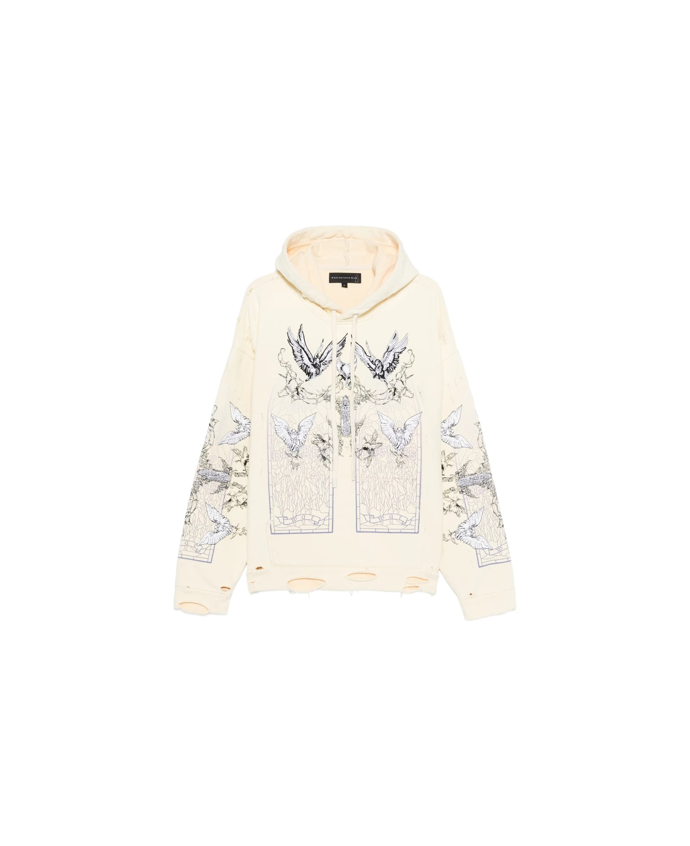 yellow bird embroidered distressed detailing hooded long sleeves ribbed hem