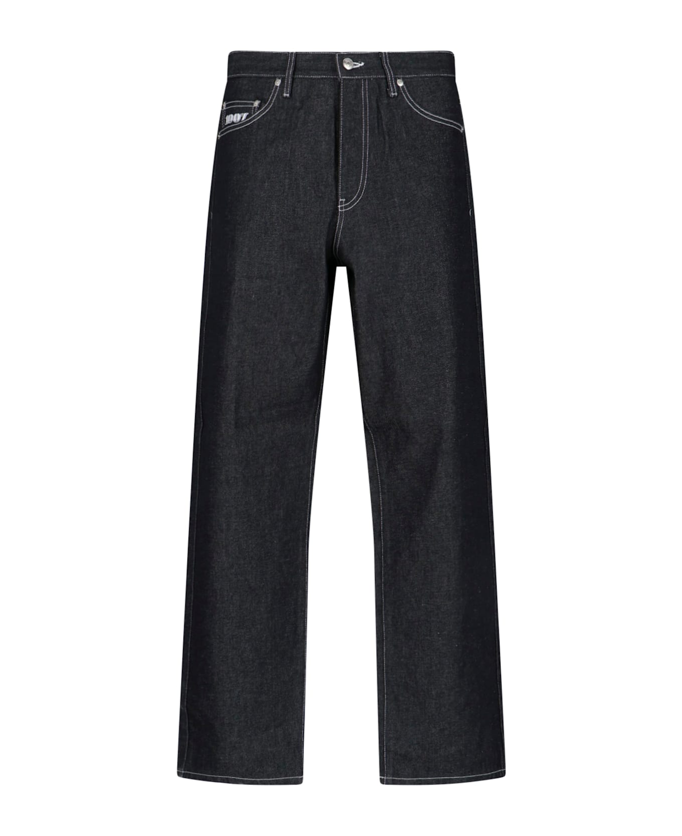 Awake NY baggy jeans in black denim with mid waist, belt loops, button and zip closure, five pocket design, contrast logo embroidery detail, back logo patch, contrasting logo embroidery on the back, wide leg.