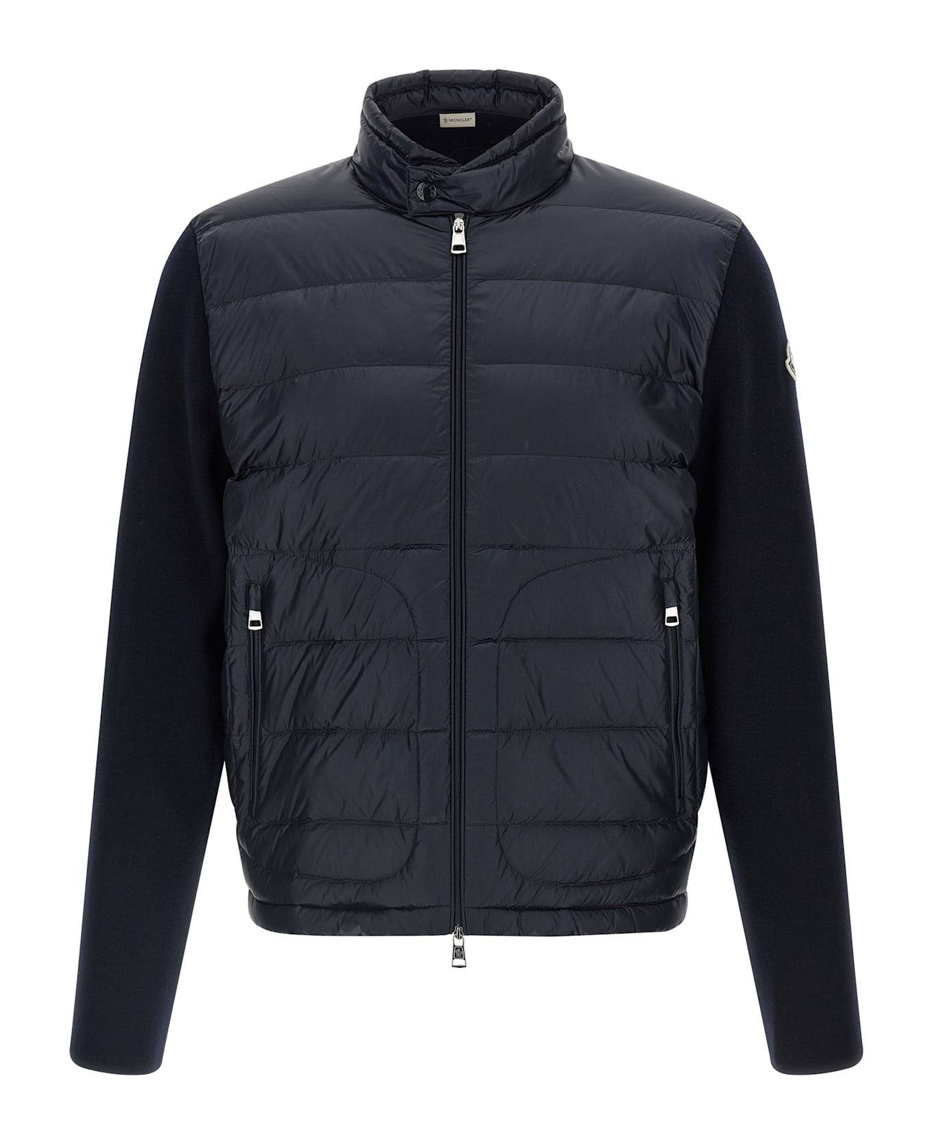 Fineness 12 extra-fine wool yarn cardigan with quilted and padded extra legér nylon front, high neck, front zip closure, pockets, long cuffed sleeves and felt logo patch appliqué.
