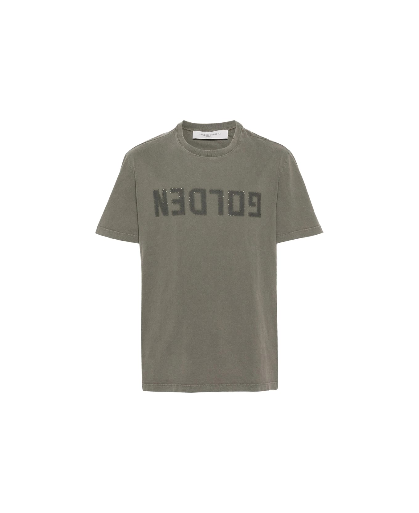 dust olive green cotton jersey texture distressed effect ribbed crew neck short sleeves logo print to the front logo plaque to the rear straight hem