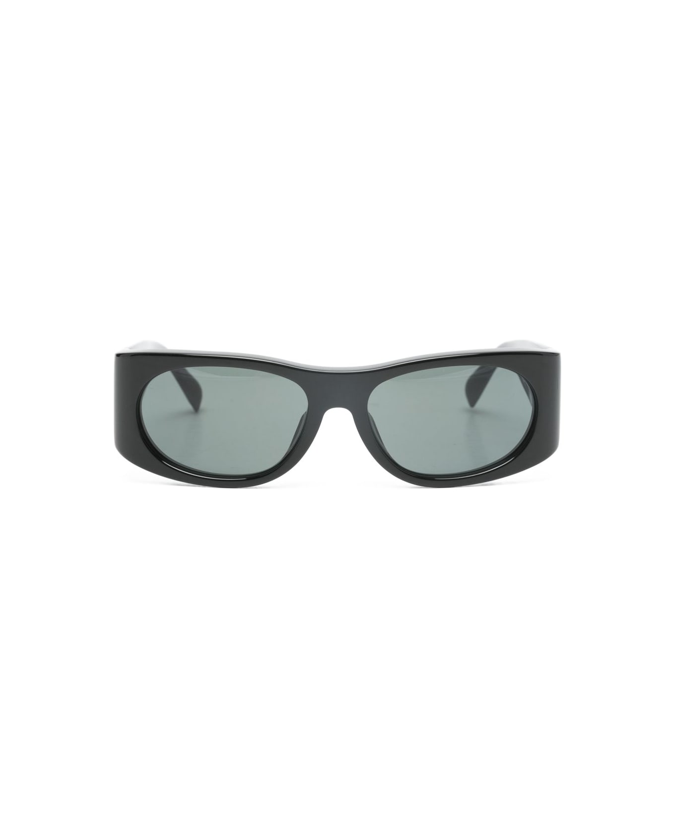 black square frame tinted lenses logo lettering nose pads These glasses come with a protective case.