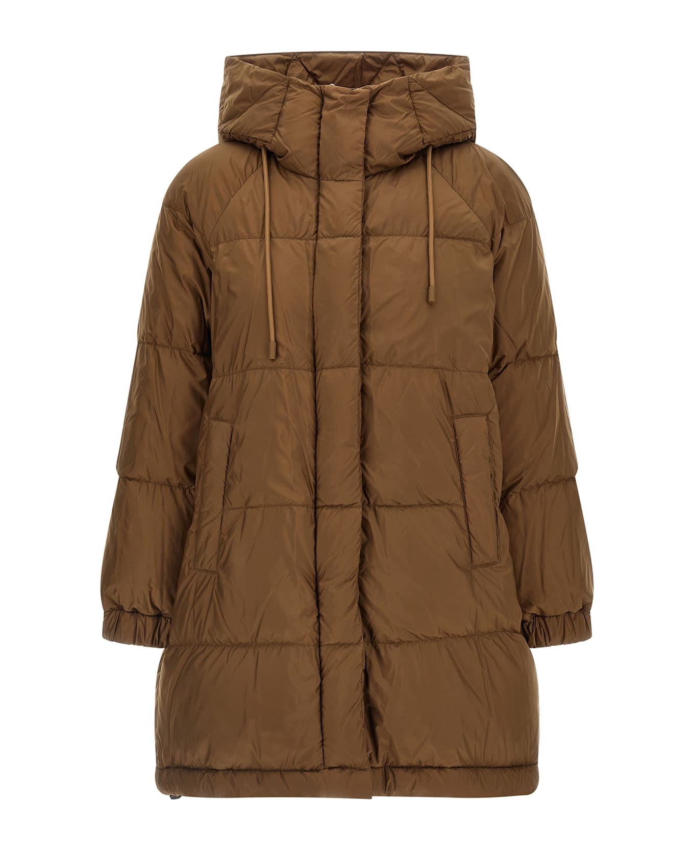 'Anfora' reversible midi parka in waterproof canvas with horizontal striped quilting and 'cipolla' pattern quilting, goose down padding, adjustable hood, high neck, front zip and snap button closure, pockets, long raglan sleeves with elastic cuffs, drawstring on the hem.