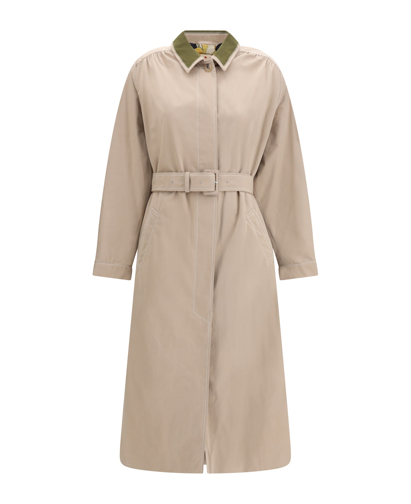 The gabardine trench by marni delivers a modern expression of elegance through refined construction and technical materials. crafted from cotton and nylon gabardine with a soft yet crisp hand, it features a water-repellent finish and contrasting topstitching that enhance its graphic character. a contrasting collar and diagonal pockets enrich the design, while covered button closure and a waist belt with buckle define the silhouette. a leather patch with embossed marni logo on the back adds a distinctive touch, completed by a fully lined construction for comfort and sophistication. Composition: 68% % Cotton, 32% % Polyamide, 100% % Viscose