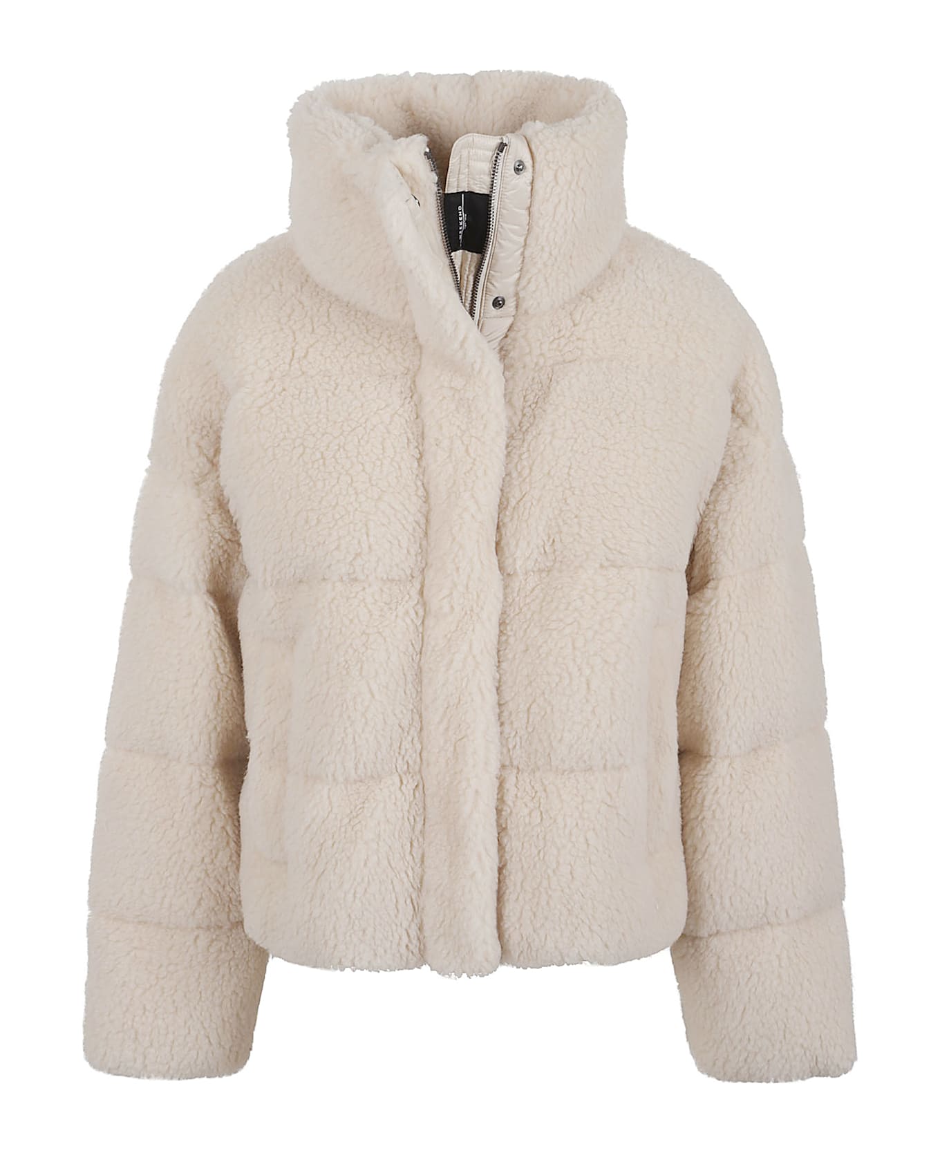 Ivory quilted jacket with high collar, hidden front closure and side welt pockets. "
