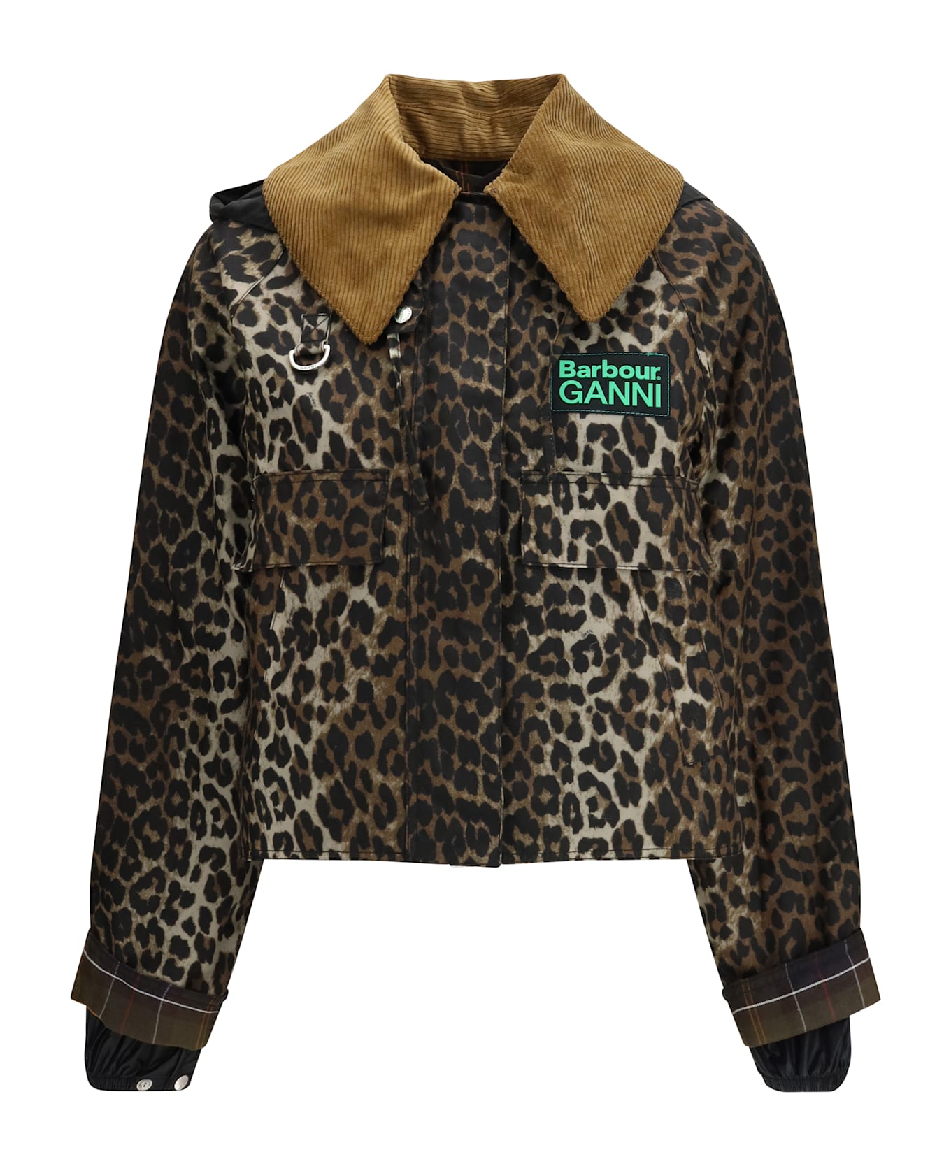 The waxed cotton anorak smock by barbour x ganni blends functional design with contemporary attitude. it features a point collar, long sleeves, and a zip fastening complemented by a press-stud placket. four front pockets two flap pockets and two side slip pockets enhance practicality, while the detachable hood with leopard print adds a bold touch and allows the piece to be adapted to different styling needs.
