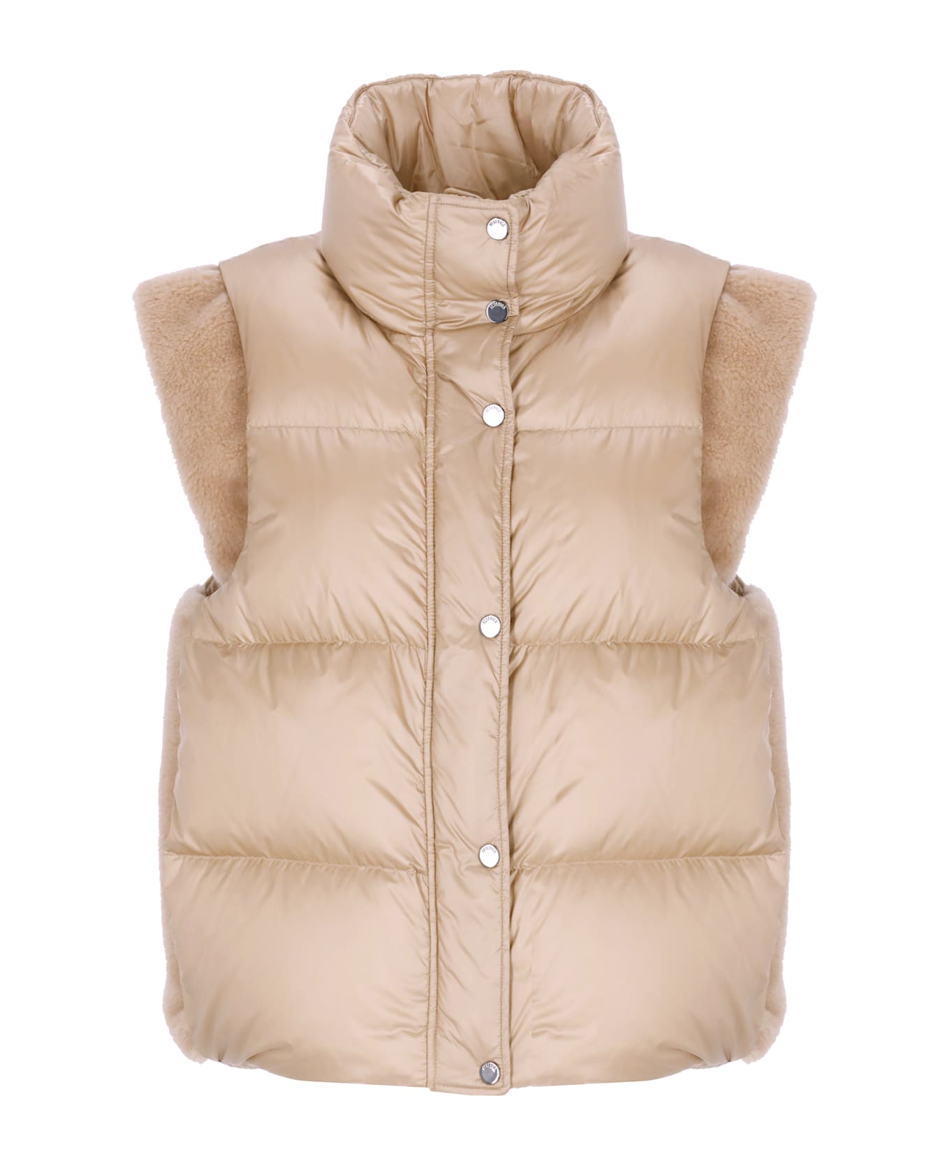 - Peserico beige woman's sleeveless down jacket - High neck - Sleeveless - Front zip and buttons fastening - Two side slit pockets - Side fur details