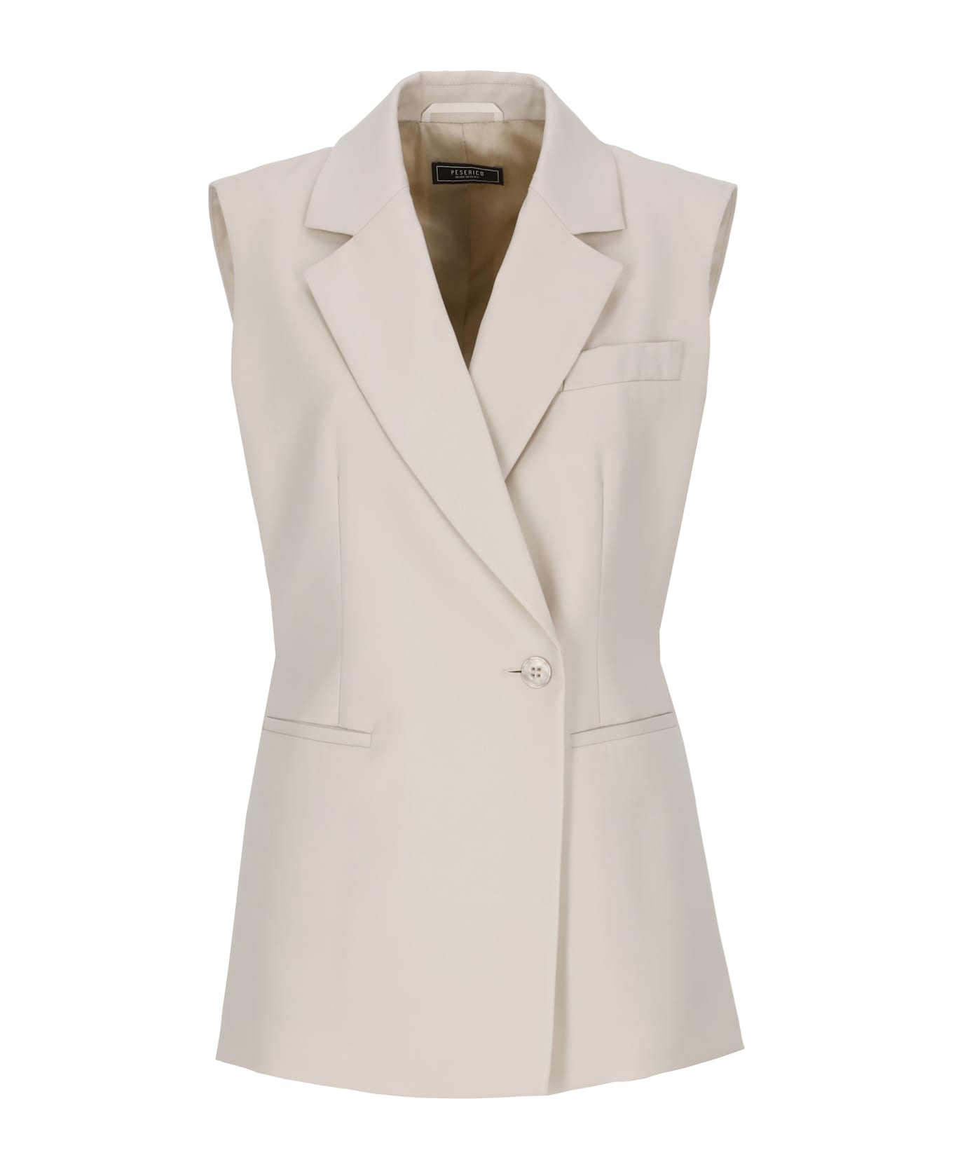 - Peserico beige woman's wool gilet - Classic lapel collar - Sleeveless - Front button fastening - Two front flap pockets - One chest pockets - Side bands with brightlight point details Composition: 100% Virgin Wool Lining:, 100% Viscose