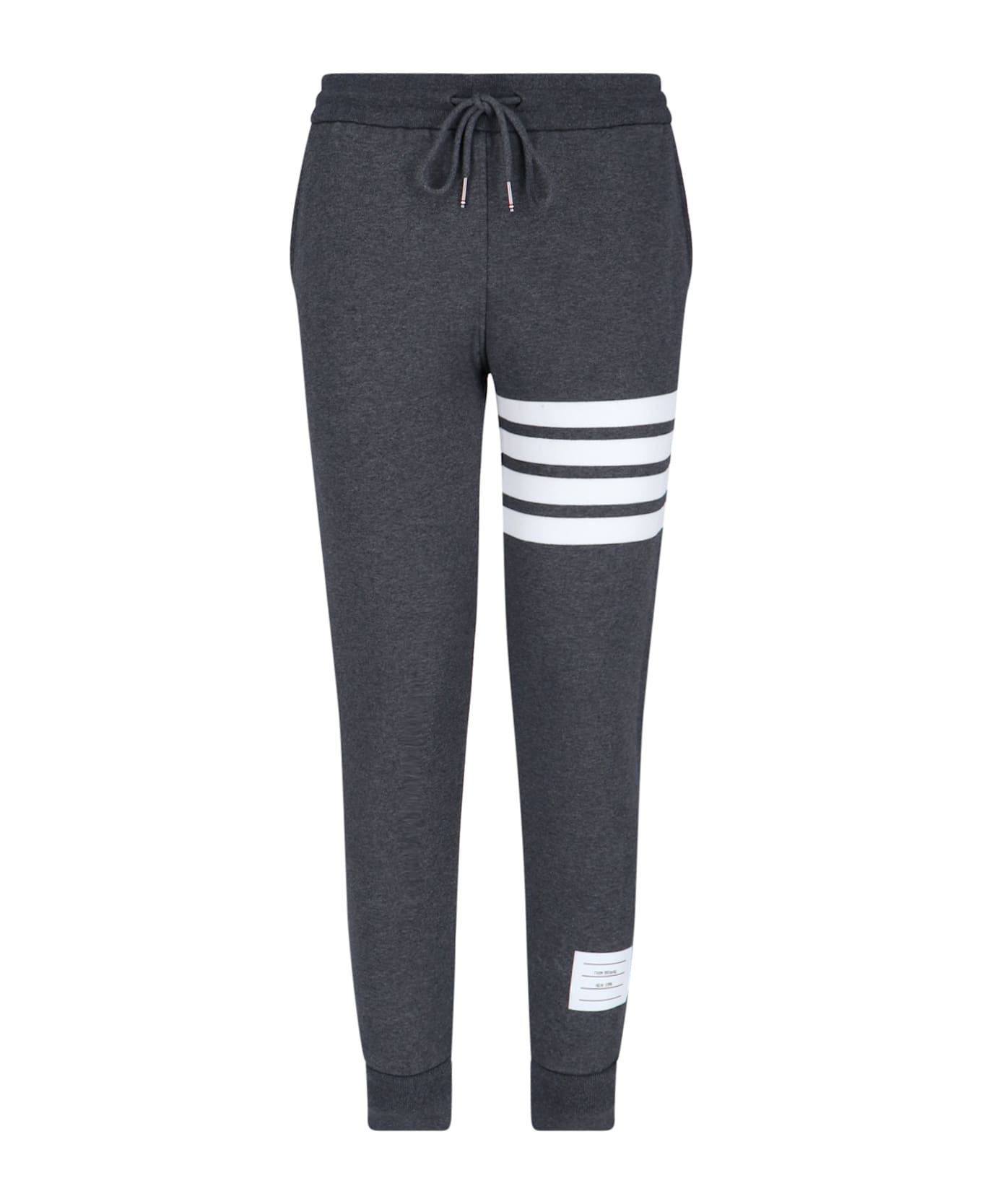 Thom Browne 'Loopback 4-Bar' dark grey cotton track pants with mid elastic waistband, drawstring closure, white band print on the front, two side pockets, white side logo label, tricolor grosgrain tab at the back, elastic details at the hem, straight leg. Composition: 100% Cotton