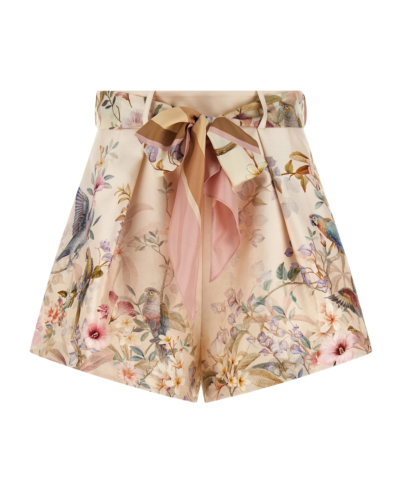 Rebellion' Aviary-print cotton and silk blend shorts with mid waist, front and back pincer, pockets, back zip closure, removable scarf belt. Twisted Romance collection. Composition: 53% silk, 47% cotton
