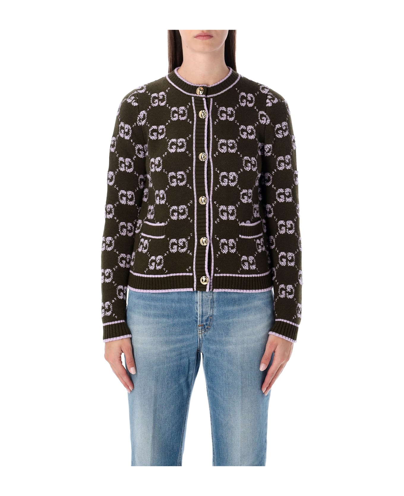 Showcasing The House s Timeless Elegance, This Gucci Cardigan Is Crafted From Gg Wool Bouclé Jacquard With An All-over Monogram Motif. The Crewneck Design Is Enhanced With Retro Gg Resin Buttons, Combining Classic Refinement With A Modern Twist. Soft And Versatile, It Can Be Styled Effortlessly For Both Casual And Elegant Occasions. All-over Gg Motif Retro Gg Resin Buttons Crewneck Long Sleeves Two Front Pockets Ribbed Trims Button Closure Alessandra Is 1,75 M And Wears Size S