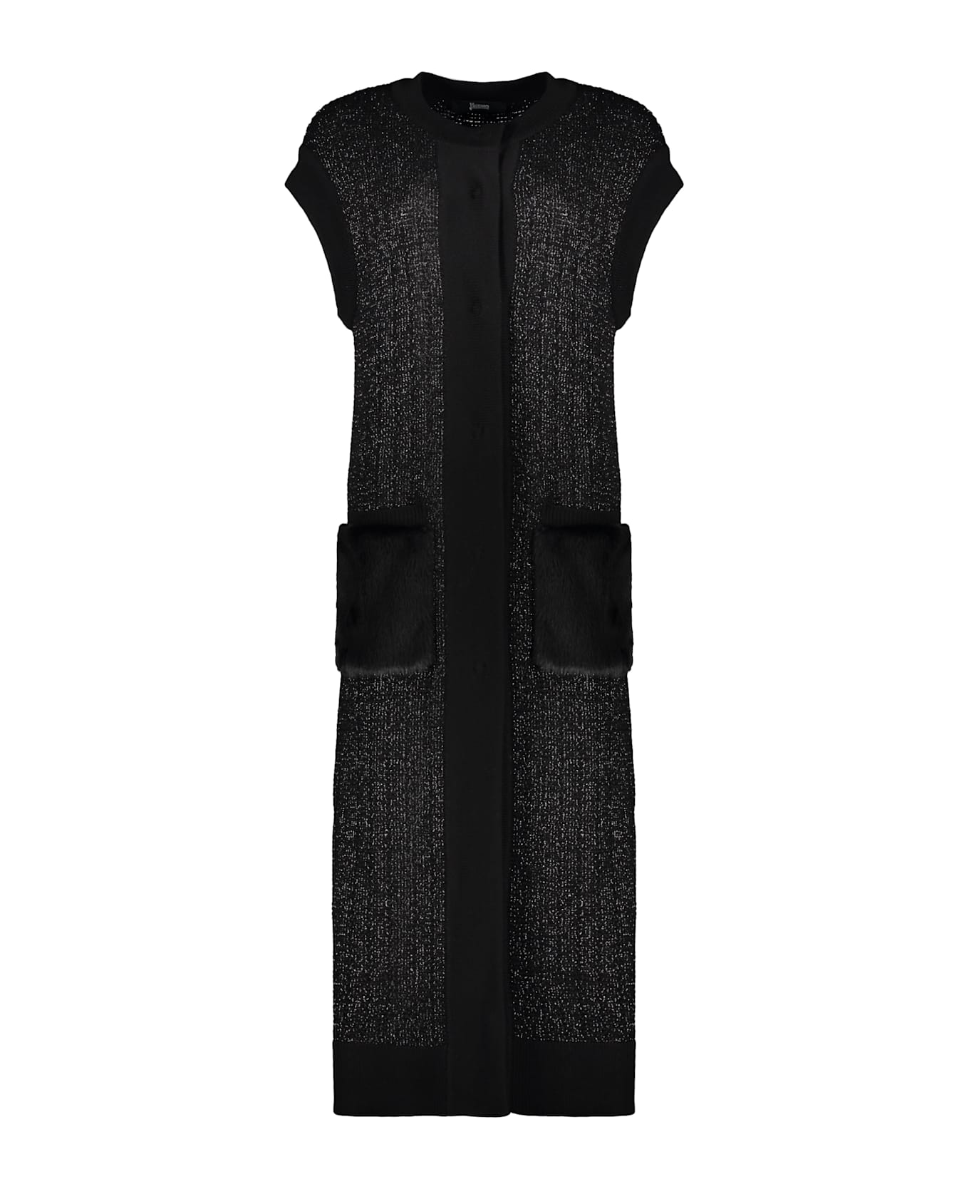 Long black cardigan with a simple and elegant design. sleeveless, it features a straight silhouette, enriched with two side pockets. ideal for casual or formal occasions, offering comfort and style. the length of the dress reaches the knee, making it versatile for different seasons. perfect to pair with elegant shoes or sandals for a sophisticated look.