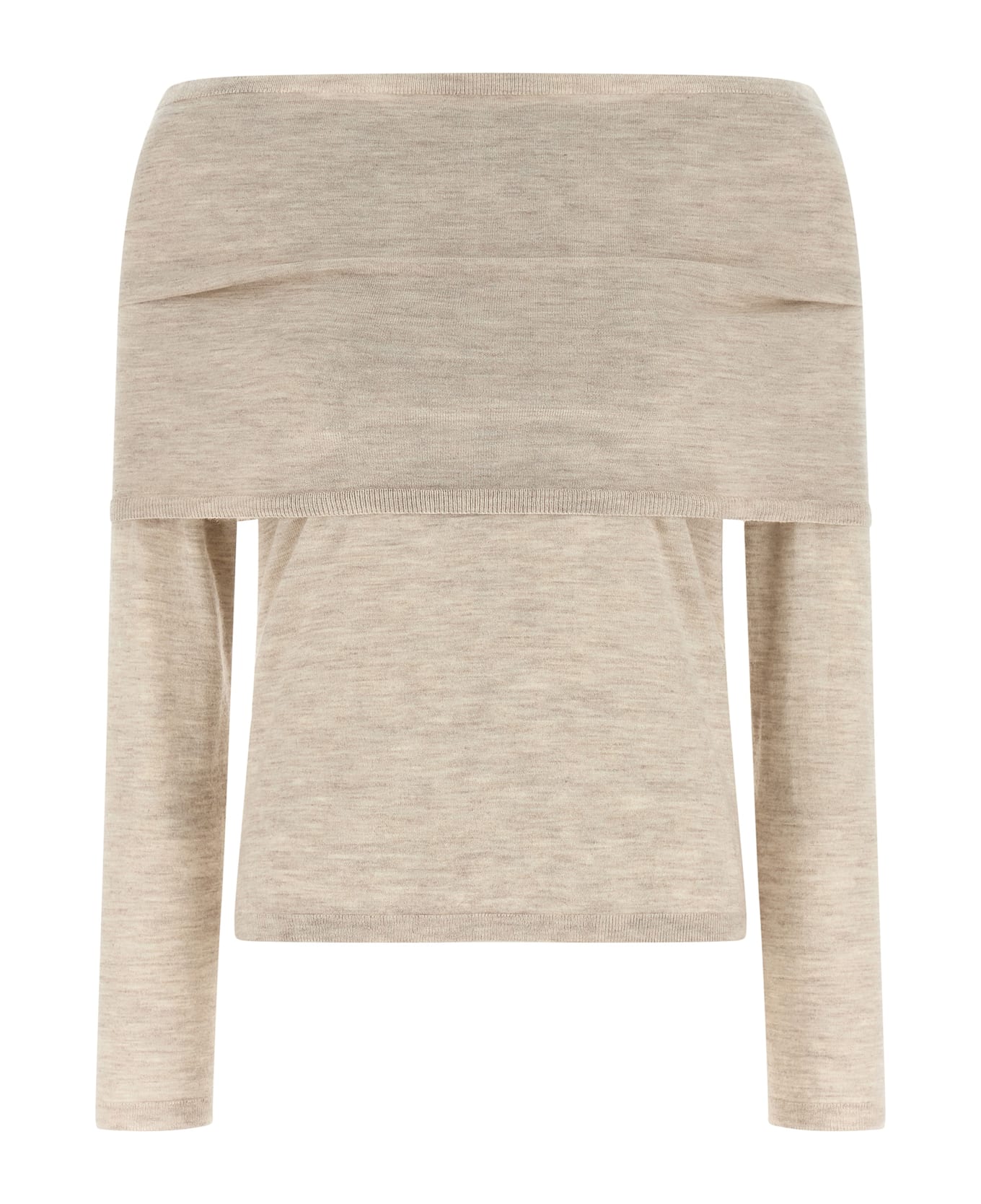 'Mxmfaretra' sweater in light pure cashmere mélange yarn with shaved stitch, boat neck, long cuffed sleeves. Removable matching fabric band to be placed on the shoulders.