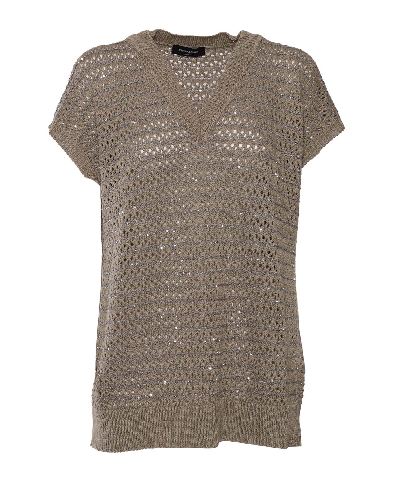 Sequin Striped Crochet V Neck Cape Sleeve Sweater
