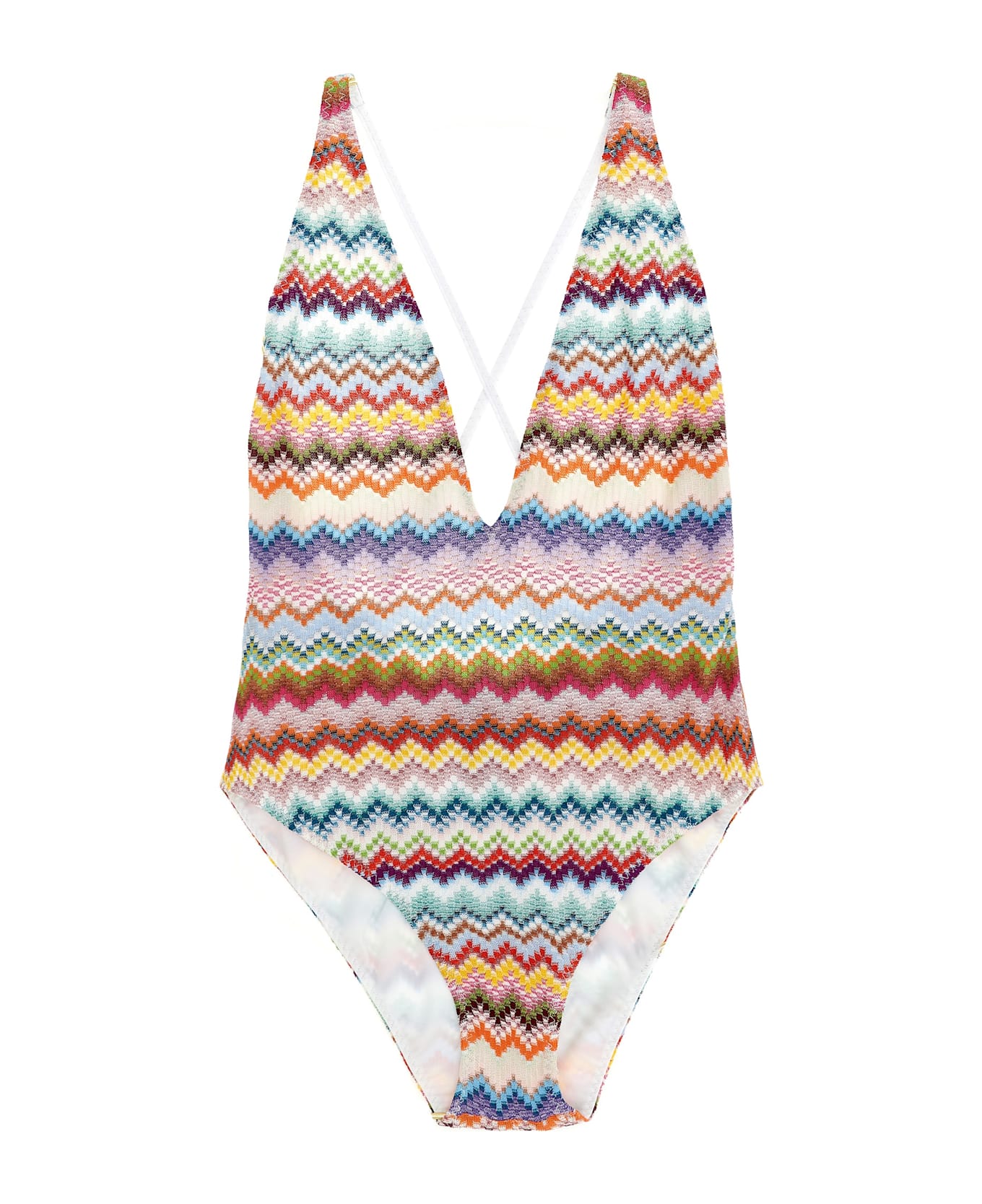 Lamé viscose one-piece swimsuit, zigzag pattern, V-neck, thin crossed shoulder straps at the back.