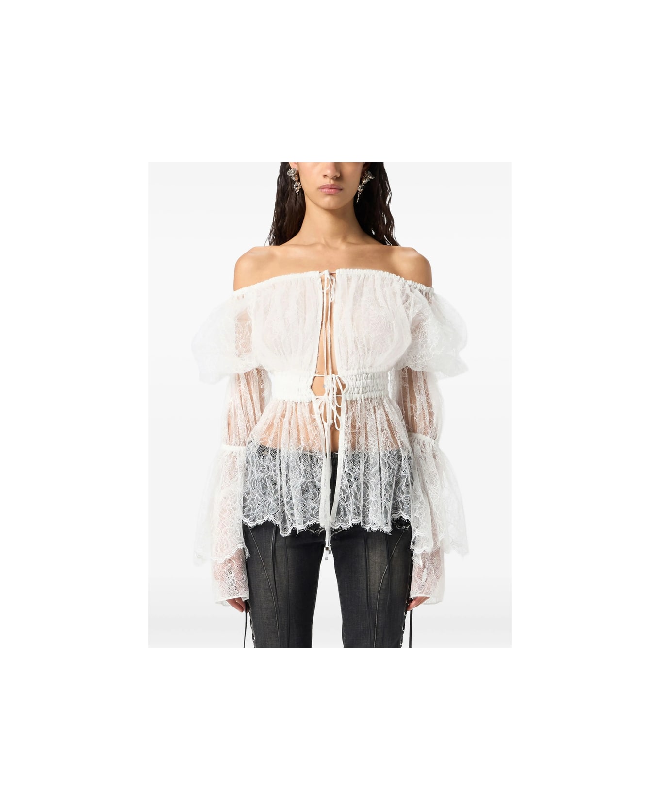 ivory white lace design off-shoulder long sleeves front tie fastening