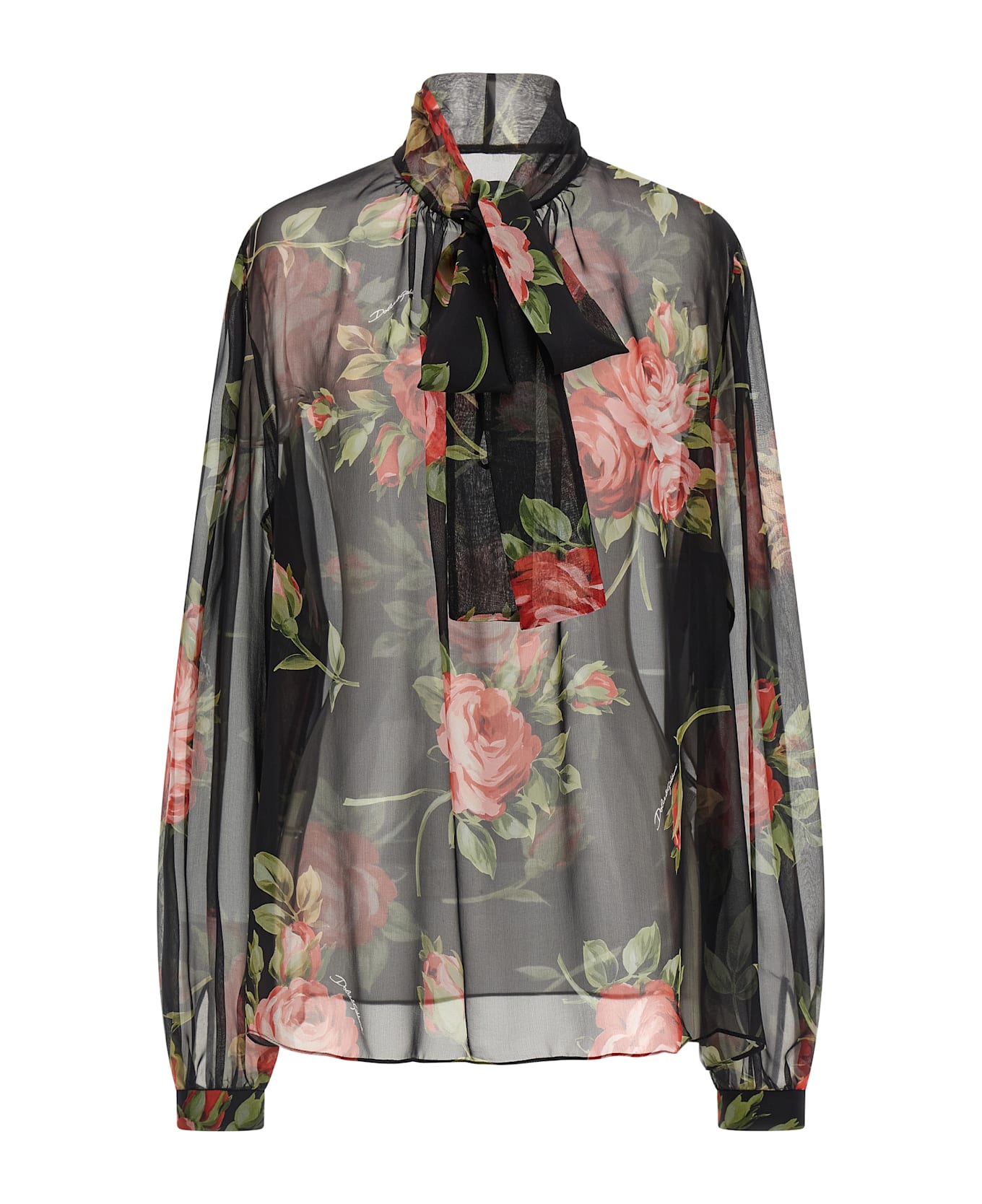 'Bouquet Rose' print semi-sheer chiffon top, lavallière collar, front button closure, long wide sleeves with cuffs and ruffles on the shoulder. The differences in print placement you might find on this product is a characteristic of Dolce&Gabbana's Handmade products. A peculiarity that makes each garment or accessory unique and exclusive.