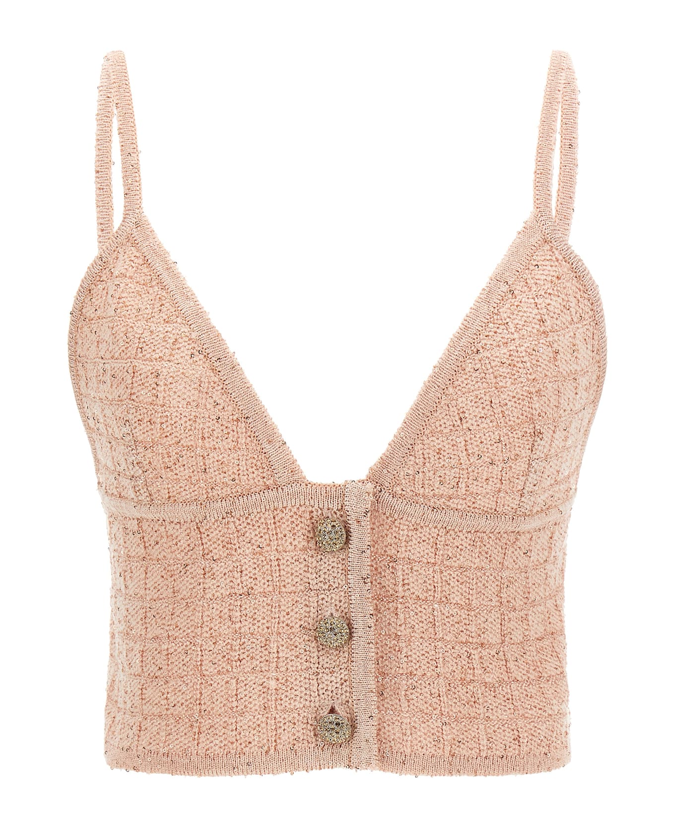 Knitted wool blend top with all-over micro sequin appliqué, triangle crop pattern, front snap jewel button closure, thin straps.