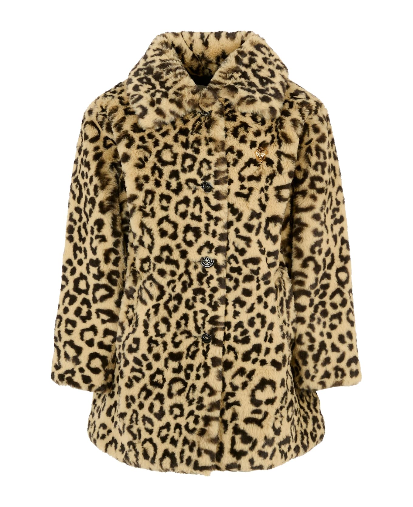 Brown faux fur coat with long sleeves, a pointed collar, a front button closure, and side pockets. It is embellished with an animal print and a metal heart applied on the chest.