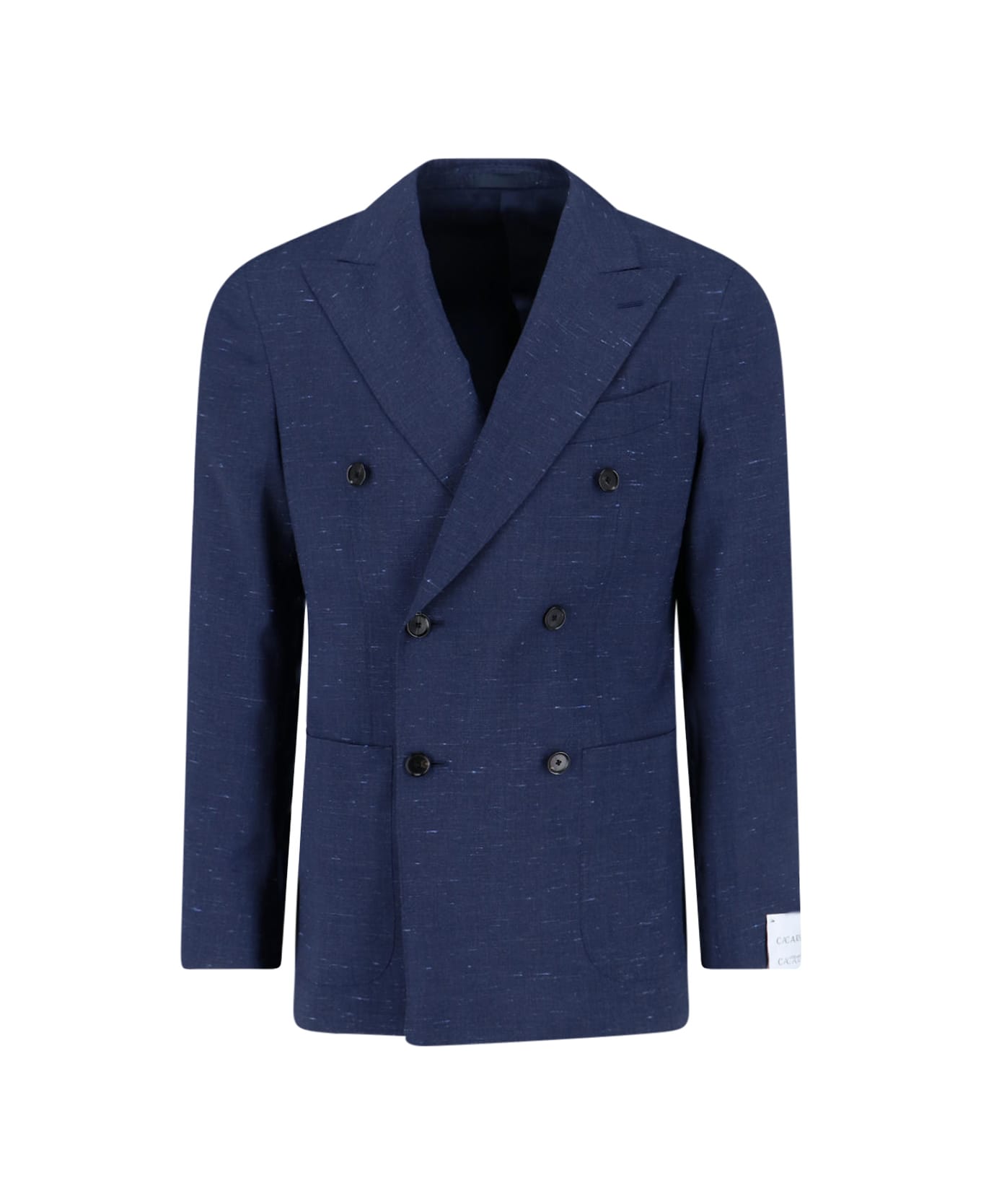 Caruso double-breasted blazer in wool and silk, blue, peak lapels, V-neck, double-breasted button closure on the front, long sleeves, two front pockets, buttons on the cuffs, logo tag on the sleeve, straight hem.