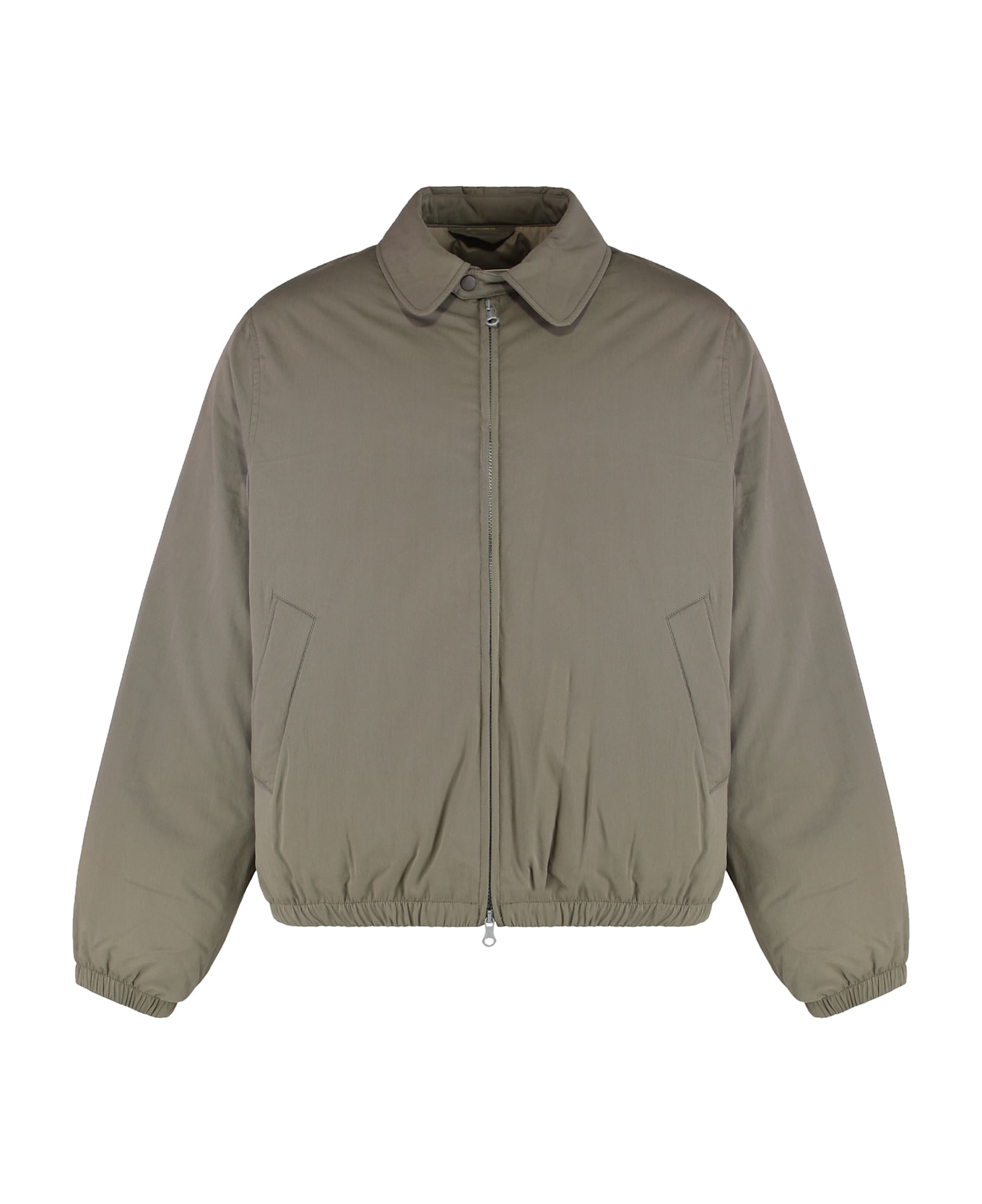 This jacket has a roomy and square fit and is equipped with down and recycled polyester padding. it features a tab on the collar with a snap closure, a double slider zipper, hem and elasticated cuffs, and two hidden snap closure pockets. perfect for mid-seasons, it offers comfort and style in your wardrobe.