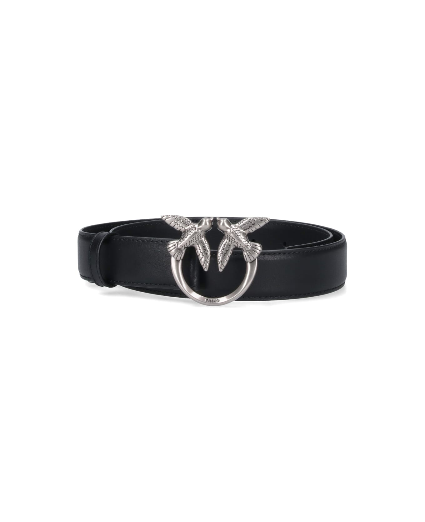 Adjustable Pinko Love Birds belt in black leather with silver metal logo buckle on the front.