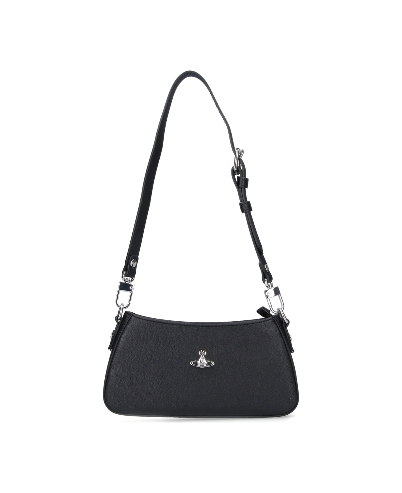 Vivienne Westwood tasha shoulder bag in black fabric, adjustable top handle, silver metal "orb" logo on the front, silver metal hardware details, single main inner compartment. Composition: 65% Polyurethane, 35% Cotton