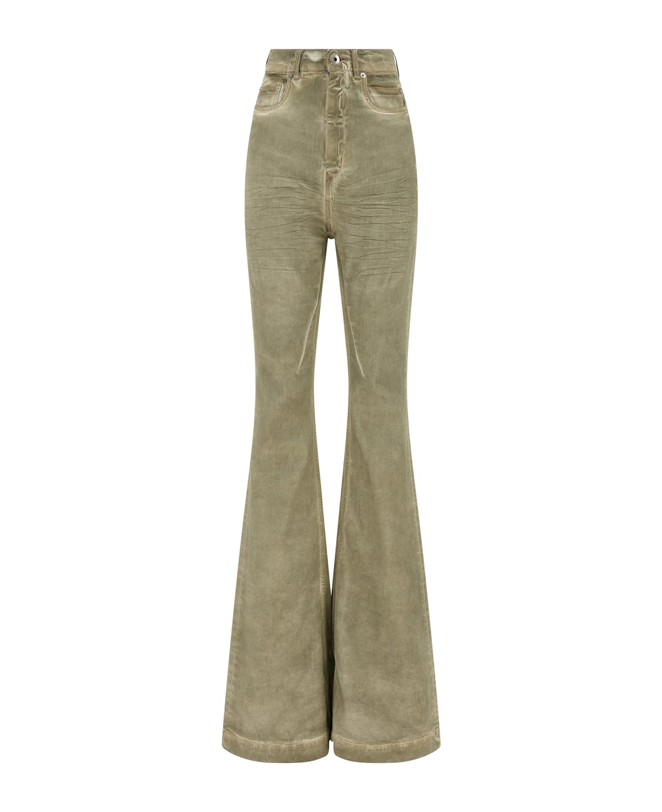 High-waisted stretch cotton denim Bolan Bootcut jeans with flared leg, five pockets, zip and front button closure. Since the foil, at the end of processing, is pressed over the garment to create a waxy touch, each piece will have a unique appearance and folds, as the foil will stick in different points depending on the garment.