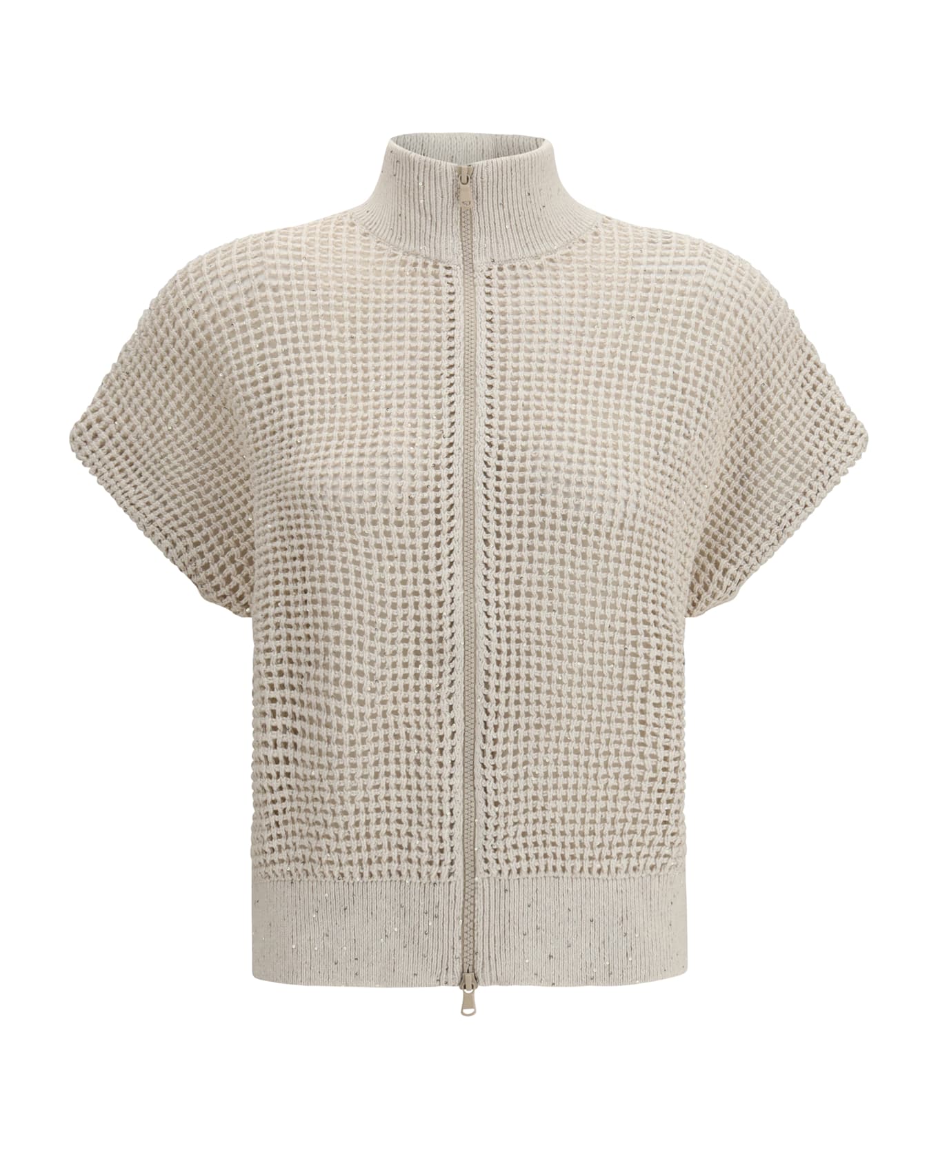 The cotton mesh cardigan with dazzling details by brunello cucinelli is an elegant and modern garment, perfect for those looking for a refined yet versatile design. made of cotton, it features a mesh construction that guarantees lightness and freshness. the double-slider zip closure and high collar offer practicality and comfort, while the ribbed hem adds a touch of definition to the silhouette. a garment that combines contemporary style and sophisticated details, ideal for a sophisticated and relaxed look.