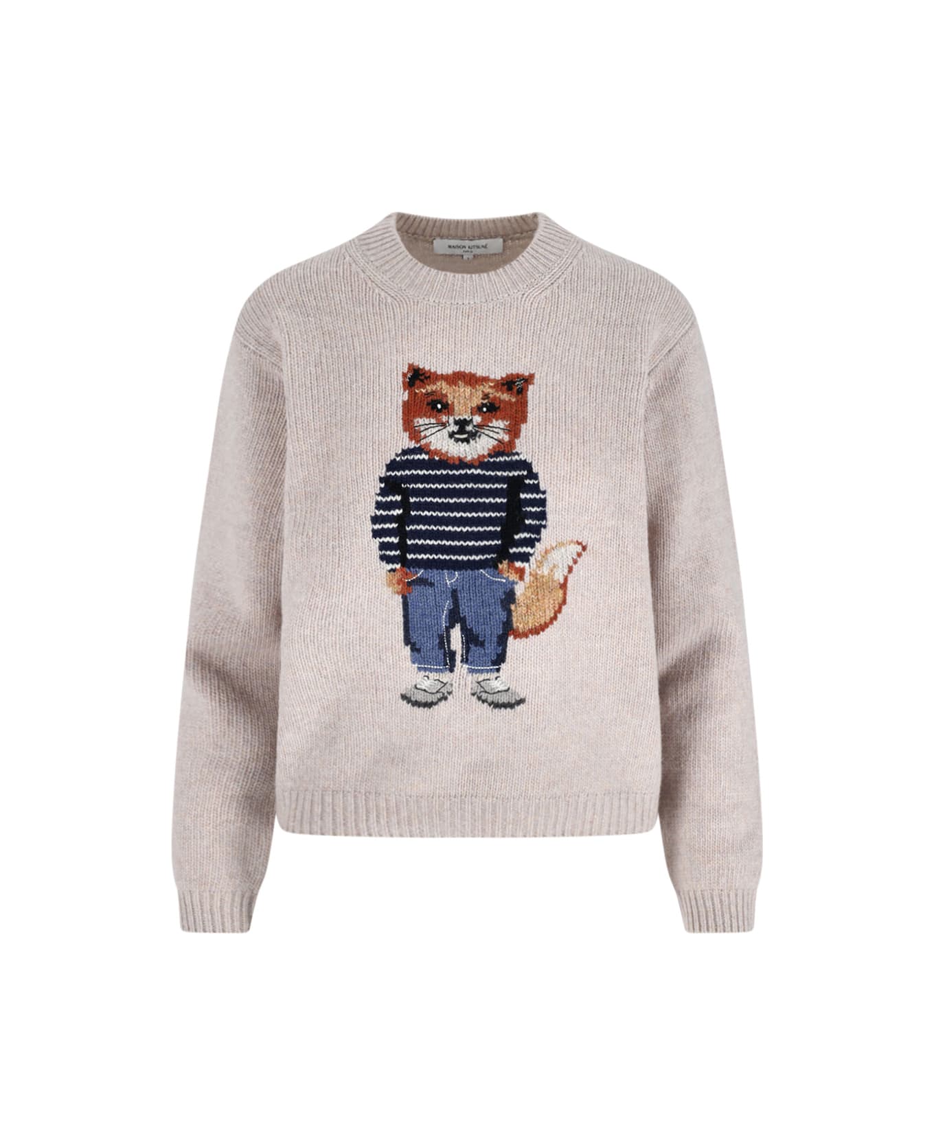 Maison Kitsuné 'Dressed Fox' sweater in beige wool blend with crew neck, long sleeves, Dressed Fox detail inlaid at the front, ribbed trims, straight hem.