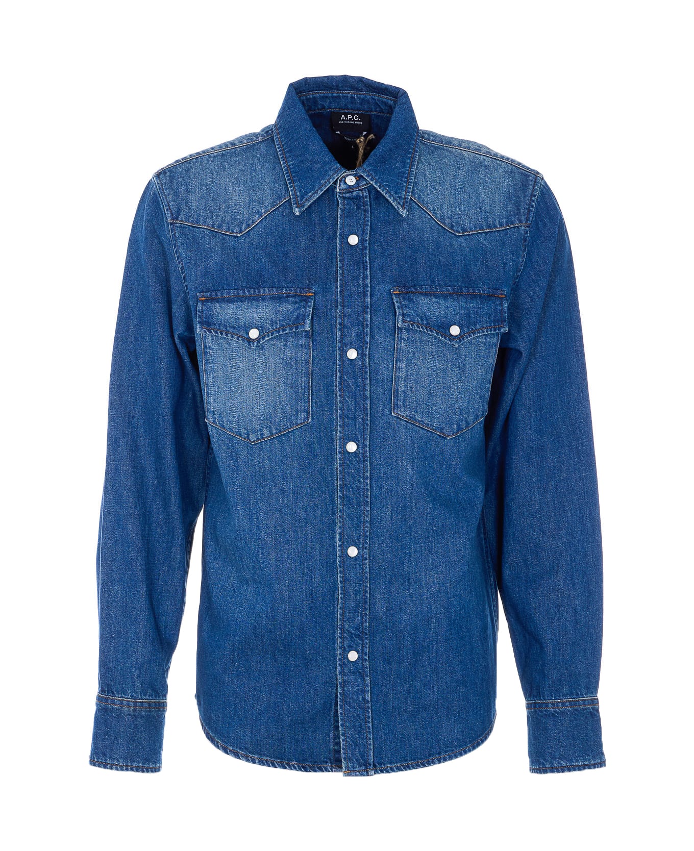 A. P. C. denim shirt with frontal buttons closure, regular collar, long sleeves, pocket on the front, buttons on cuffs