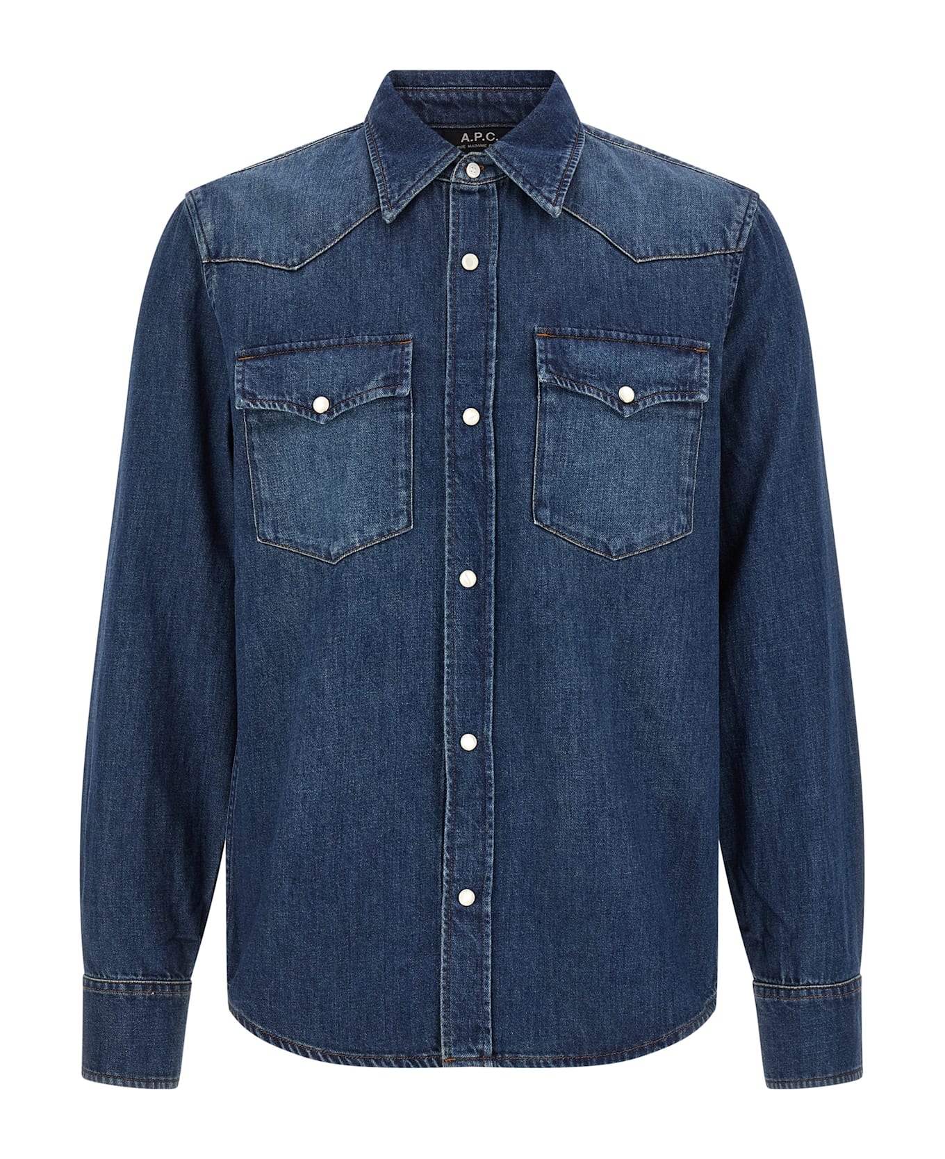 'Western' shirt in delavé cotton denim with contrast stitching, pointed collar, front snap button closure, pockets, long cuffed sleeves, rounded hem. SUSTAINABLE: This product is made with organic cotton.