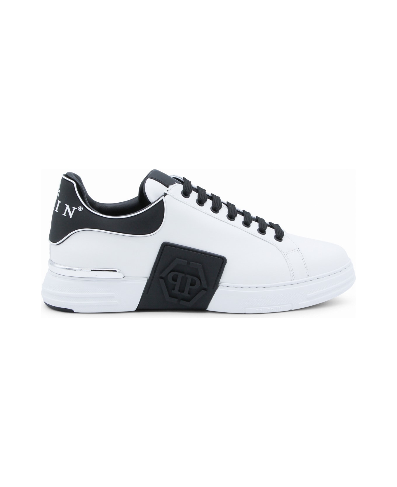 White and black leather sneakers from Philipp Plein featuring laces fastening, round toe, lateral logo, branded heel counter and rubber sole.