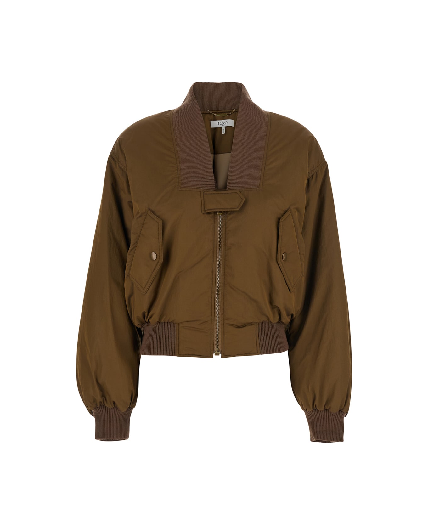 Brown Bomber Jacket With V Neck And Front Zip Closure In Tech Fabric Woman
