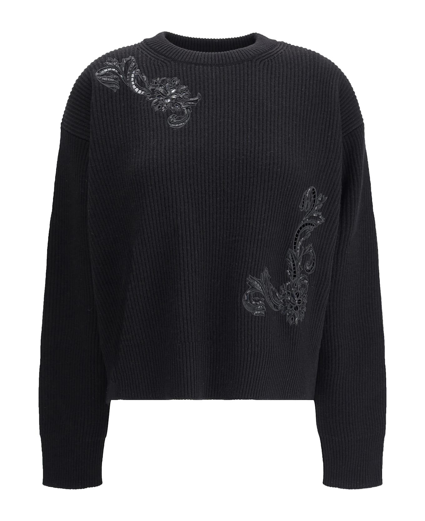 The barocco leaf embroidered sweater by versace is an elegant knitted wool top embellished with a refined barocco leaf motif thread embroidery, enriched with cut-outs and tone-on-tone micropaillettes. the design features a classic crew neck, long sleeves and ribbed edges, offering a comfortable fit with a touch of sophisticated opulence typical of the house.