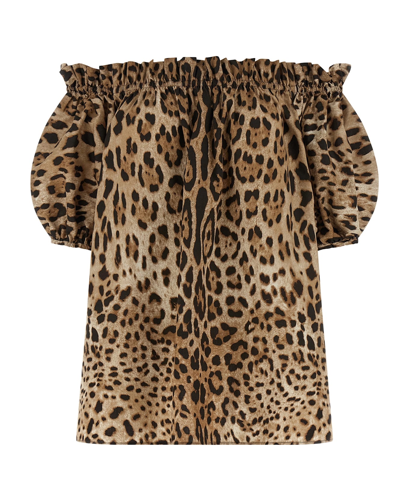 Off-the-shoulder top in stretch cotton poplin with iconic animal print, straight 'Bardot' neck with ruffles, short balloon sleeves with elastic cuffs, flared silhouette. Composition: 100% cotton