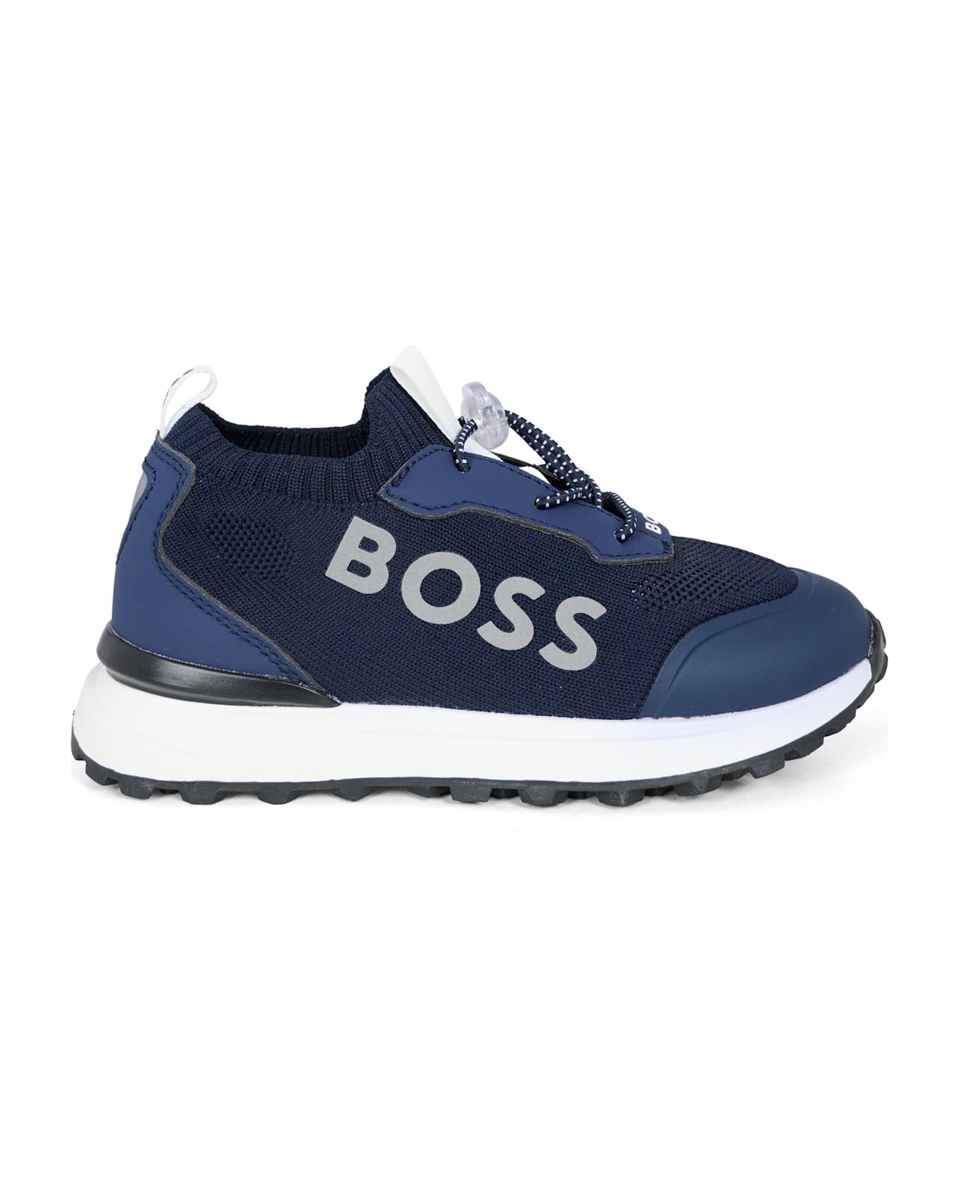 Blue sock sneakers with white rubber soles, elastic laces with drawstrings, a pull tab on the back, and a round toe. They are embellished with a side logo.