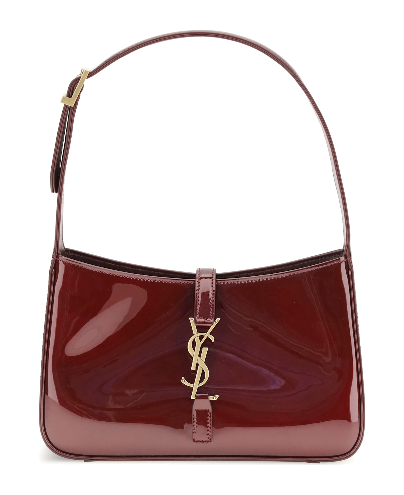 The le 5 à 7 shoulder bag by saint laurent, made of patent leather, combines elegance and practicality. featuring an adjustable shoulder strap and hook-and-loop closure with the ysl initials woven in, it has bronze-colored metallic parts that accentuate its refined design. the interior is functional with a main compartment and a zippered pocket for convenient organization. a sophisticated and versatile accessory perfect for any occasion.