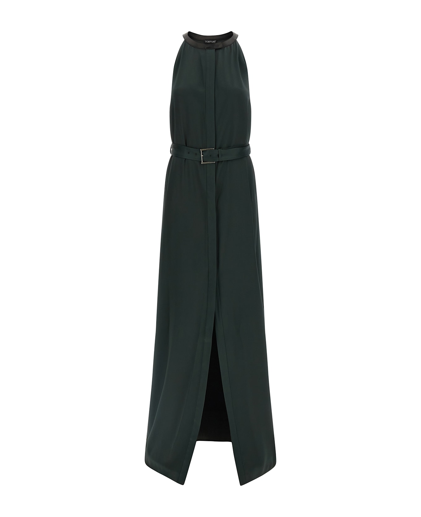 Long dress in crêpe satin, American neckline with contrasting leather detail, button closure and front split, sleeveless, removable belt. Composition: 73% acetate, 27% viscose