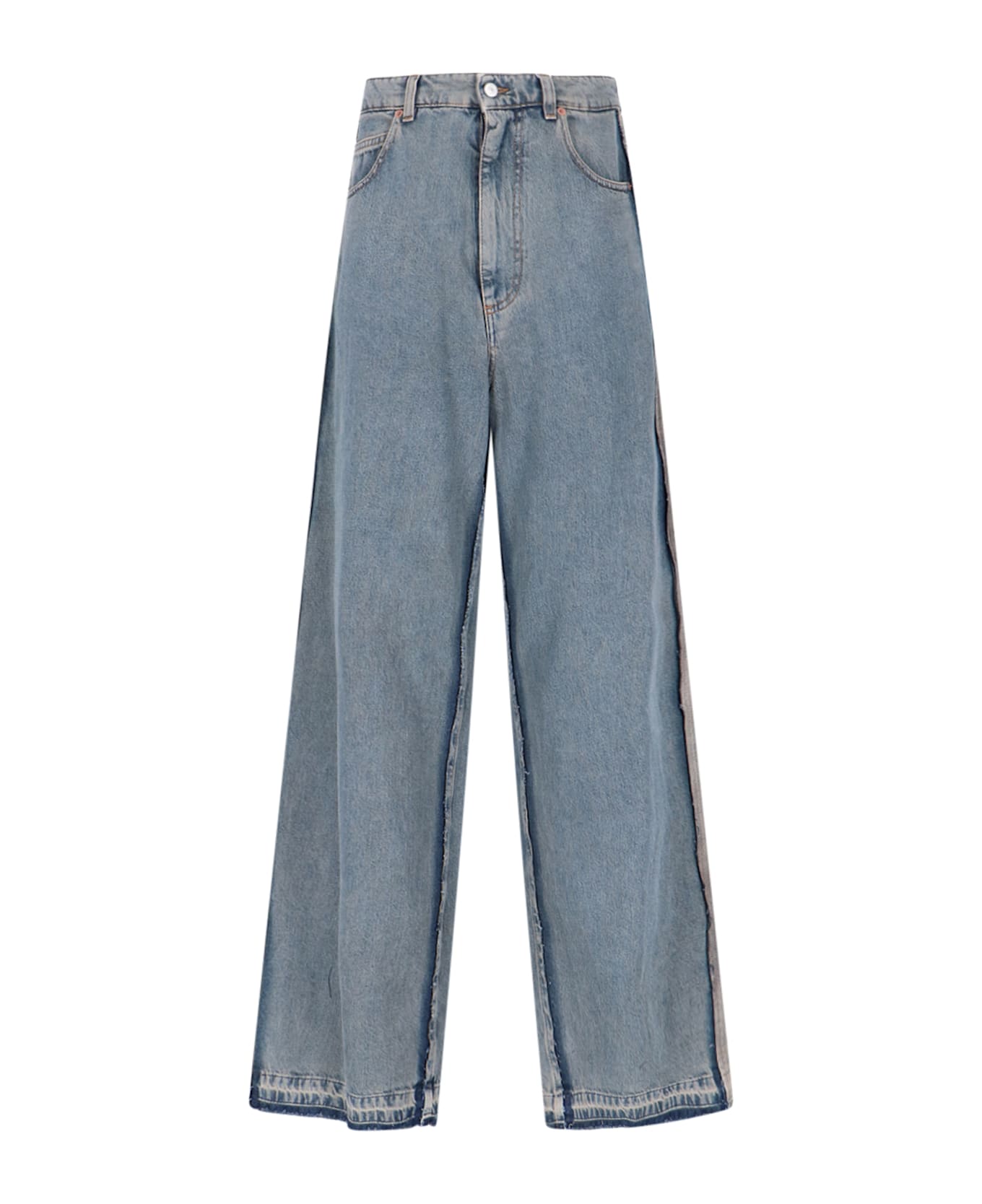 Maison Margiela wide jeans in light blue cotton denim with distressed effect, low waist, belt loops, button and zip closure, five-pocket design, suede logo patch on the back, embossed fringed detail on the sides, wide leg.