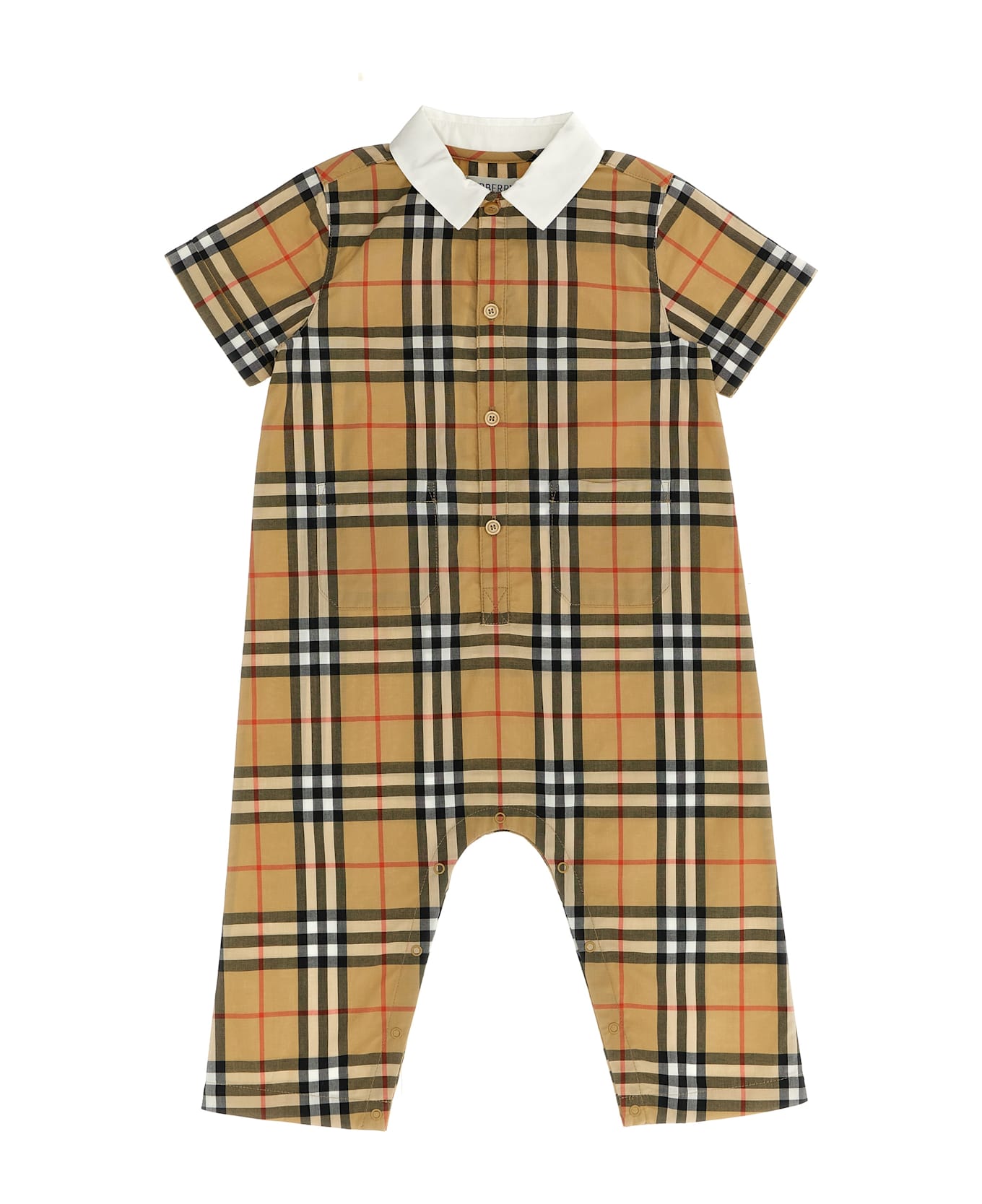 Andreas' woven cotton straw with Burberry Check, contrast collar, pockets and front button closure, short sleeves with turn-up on the cuffs, snap button closure in the crotch, long leg. Composition: 100% cotton