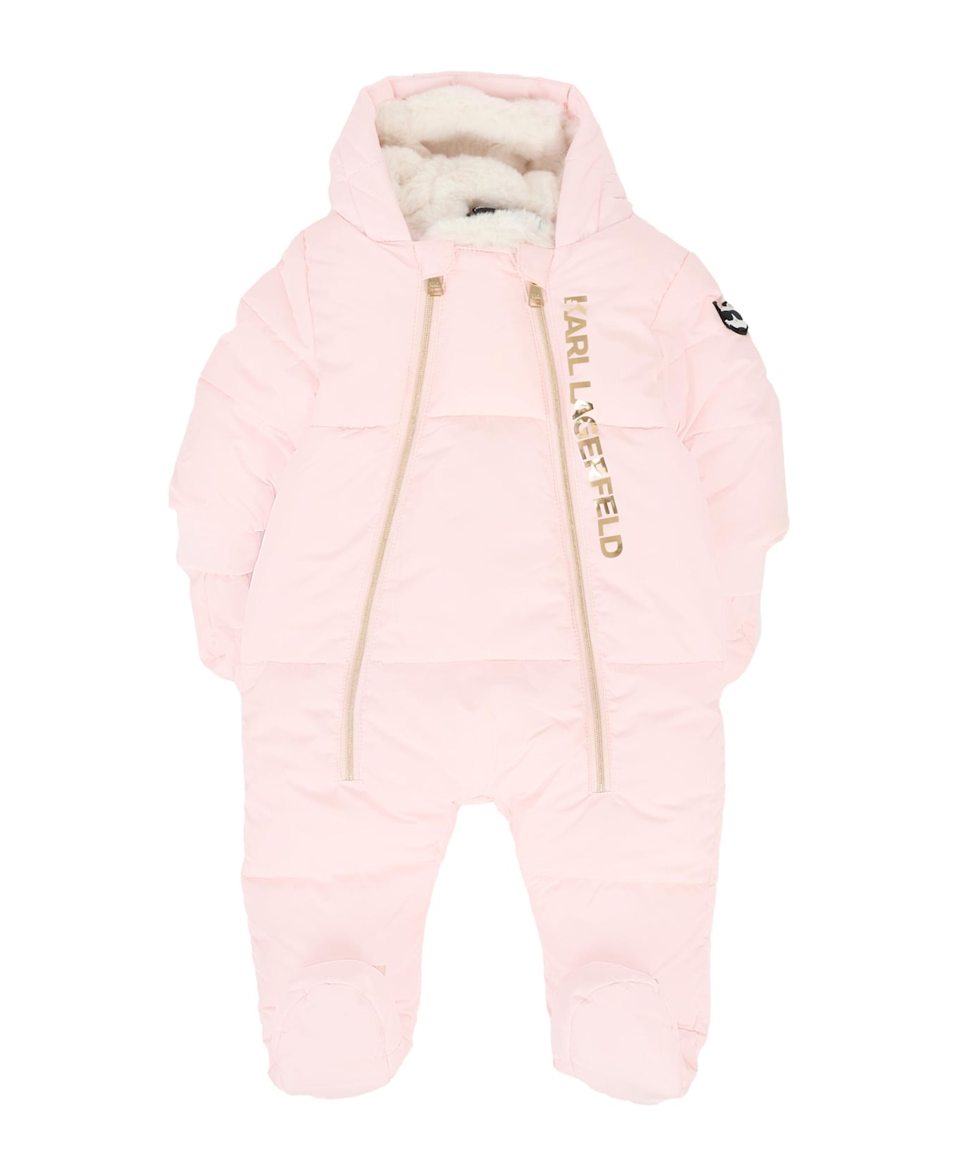 Padded and quilted pink tracksuit down jacket, eco-shearling interior, long sleeves, hood, double zip front fastening, removable mittens and feet. It is decorated with Choupette on the sleeve and logo, metallic effect, on the chest.